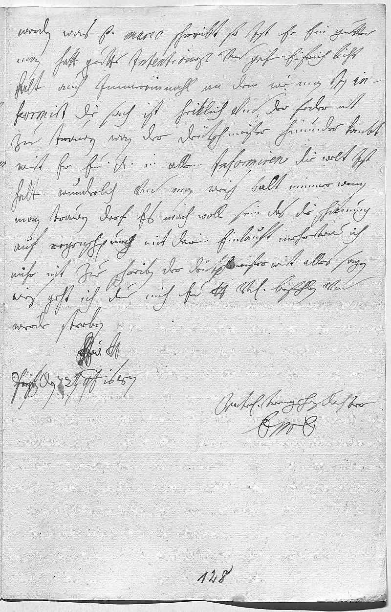 0038worden. Was Pater Marco schreibt, so ist er ein gutter 0039man, hatt gutte intentioneß vnd gahr eifrich, licht 0040halt auch immereinmahl an dem, wie man ihn in- 0041formirt. Die sach ist heiklich vnd der feder nit 0042zue trawen. Wan der Deütschmeister hinunder kombt, 0043wirt er ewer Durchlaucht in allem informiren, die welt ist 0044halt wunderlich vnd man weis balt nimmer, wem 0045man trawen derf. Es mach woll sein, das die schikunng 0046auf Regenschpurch mit darin einlauft. Mehr traw ich 0047mihr nit zue schreiben, der Deütschmeister wirt alles sagen 0048wies geht. Ich due mich ewer Liebden vnterdehnigst befehlen vnd 0049werde sterben 0050ewer Durchlaucht 0051vnterdehnigste trewgehorsamste dochter 0052EMT 0053Presburg den 22ten novembris 1687