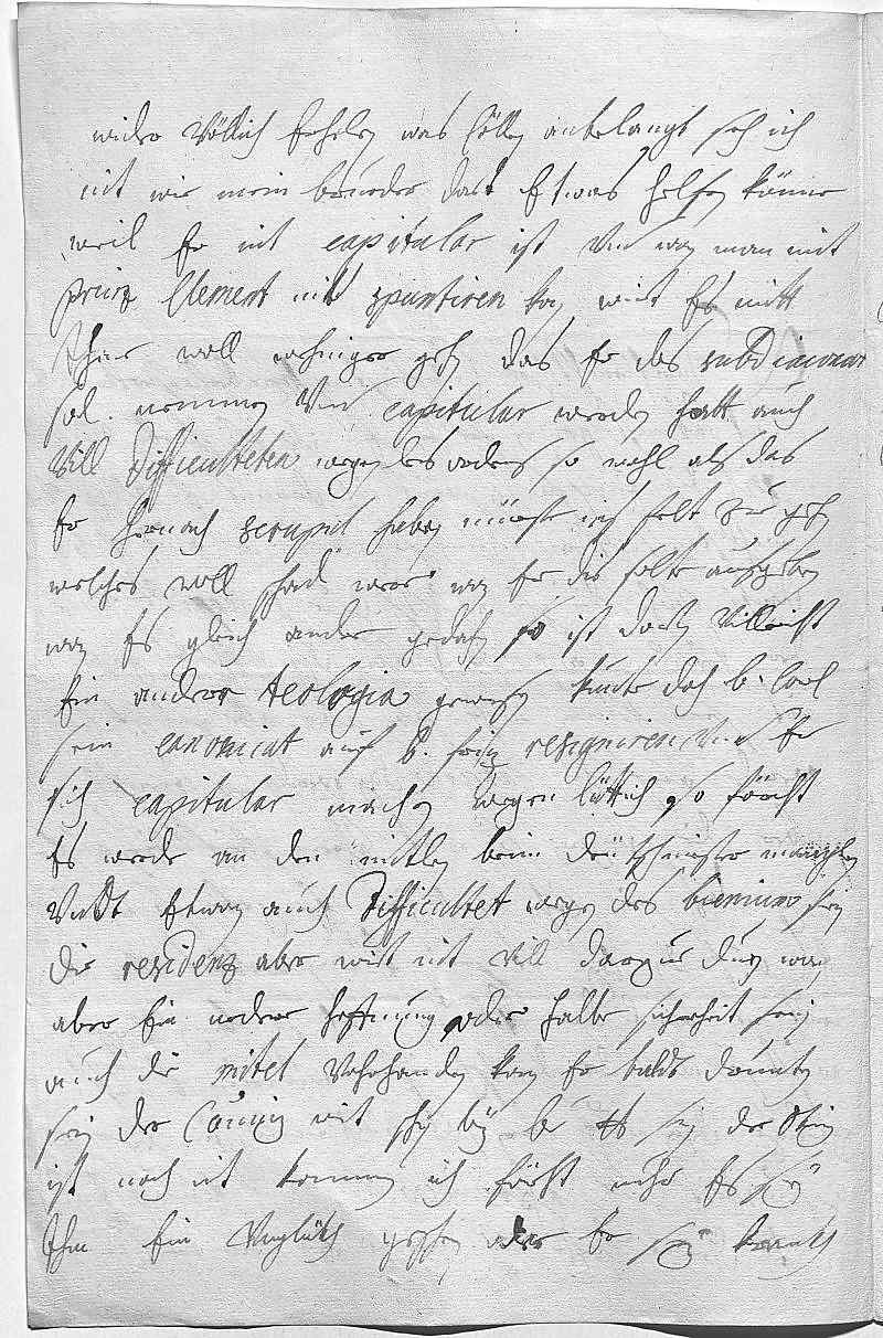 0017wider völlich erholen. Was Cöllen anbelangt, seh ich 0018nit, wie mein brueder dort etwas helfen könne, 0019weil er nit capitular ist, vnd wan man mit 0020Prinz Clement nit spuntiren kan, wirt es mitt 0021ihme woll wehniger gehn. Das er das subdiaconat 0022sol nemmen vnd capitular werden, hatt auch 0023vill difficulteten wegen des ordens so wohl, als das 0024er hernach scrupul haben müeste ins felt zue gehn, 0025welches woll schad were, wan er dis solte aufgeben. 0026Wan es gleich andre gedahn, so ist dorten villeicht 0027ein andere teologia gewesen. Kunte doch bruder Carl 0028sein canonicat auf bruder Friz resigniren vnd er 0029sich capitular machen. Wegen Lüttich, so förcht, 0030es werde an den mitlen beim Deütschmeister manglen 0031vndt etwan auch difficultet wegen des bienium sein. 0032Die residenz aber wirt nit vill darzue duen, wan 0033aber ein nedere hoffnung oder halbe sicherheit sein, 0034auch die mitel vohrhanden, kan er baldt drunten 0035sein. Der Cauniz wirt schon bey ewer Liebden sein. Der Oting 0036ist noch nit kommen, ich förcht nuhr, es sey 0037ihm ein vnglükh geschen oder er sey krankh
