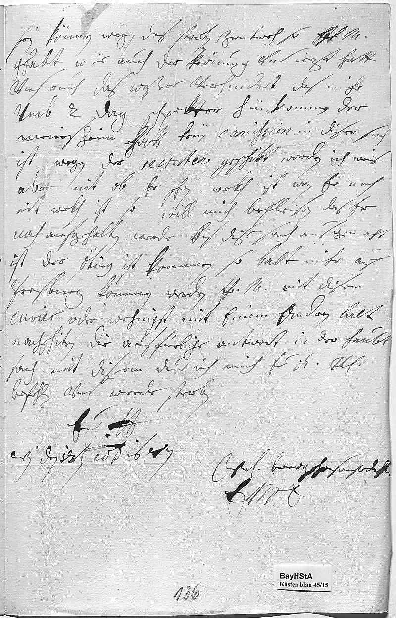 0039sein können wegen des starken zentweh, so ihr Mayestät 0040gehabt, wie auch der krönung, vnd iezt hatt 0041vns auch das waßer verhindret, das mihr 0042vmb 2 dag schpetter hinkommen. Der 0043Meiersheim hatt kein comission in diser sach, 0044ist wegen der recruten geschikt worden. Ich weis 0045aber nit, ob er schon wekh ist, wan er noch 0046nit wekh ist, so will mich befleisen, das er 0047noch aufgehalten werde, bis dise sach aus gemacht 0048ist. Der Öting ist kommen, so balt mihr auf 0049Presburg kommen, werden ihr Mayestät mit disem 0050curier oder wehnigst mit einem andren balt 0051nachschiken die ausfürliche antwort in der haubt 0052sach. Mit disem due ich mich ewer Durchlaucht vnterdehnigst 0053befehlen vnd werde sterben 0054ewer Durchlaucht 0055vnterdehnigste trewgehorsamste dochter 0056EMT 0057Wien den 13ten decembris 1687