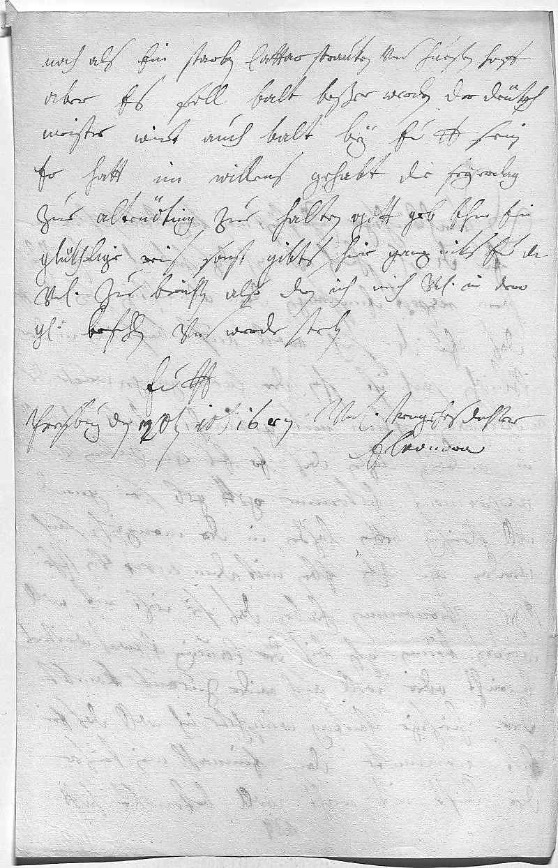 0017noch als ein starken cattar, strauken vnd huesten, hoff 0018aber, es soll balt beßer werden. Der Deütsch 0019Meister wirt auch balt bey ewer Durchlaucht sein, 0020er hatt im willens gehabt, die feyerdag 0021zue Altenöting zue halten, gott geb ihm ein 0022glükhlige reis. Sonst gibts hier ganz niks ewer Durchlaucht 0023vnterdehnigst zue berichten, also due ich mich vnterdehnigst in dero 0024gnade befehlen vnd werde sterben 0025ewer Durchlaucht 0026vnterdehnigste trewgehorsamste dochter 0027Eleonora 0028Presburg den 20ten decembris 1687