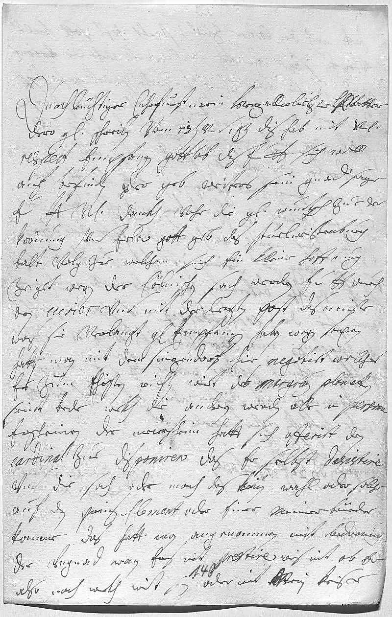 0001Durchleüchtiger Cuhrfürst, mein herzallerliebster herr vatter 0002Dero gnädiges schreiben vom 12ten vnd 19ten dis hab mit vnterdehnigstem 0003respect empfangen, gottlob, das ewer Durchlaucht sich woll 0004auf befinden, der geb weiters sein gnad. Sagen 0005ewer Durchlaucht vnterdehnigsten dankh vohr die gnädigen wuntsch zue der 0006krönung vnd Erla, gott geb, das Stuelweißenburg 0007balt volg, zue welchem sich ein kleine hoffnung 0008zeiget. Wegen der cölnischen sach werden ewer Durchlaucht durch 0009den curier vnd mit der lezten post das meiste, 0010was sie verlangt, gnädigst empfangen haben. Wegen Saxen 0011hatt man mit dem Sinzendorf hier negotirt, welches 0012er zum ehisten richten wirt. Des Margrauen plonetten 0013seint bede wekh, die andren werden alle in persona 0014erscheinen. Der Meiersheim hatt sich offerirt, den 0015Cardinal zue disponiren, das er selbst desistire 0016vnd die sach, oder mach, das kein wahl, oder solche 0017auf den Prinz Clement oder einer meiner brüeder 0018komme. Das hatt man angenommen mit bedroung 0019der vngnad, wan ers nit prestire. Weis nit, ob er 0020also noch wekh wirt sein oder nit. Mein Keiser