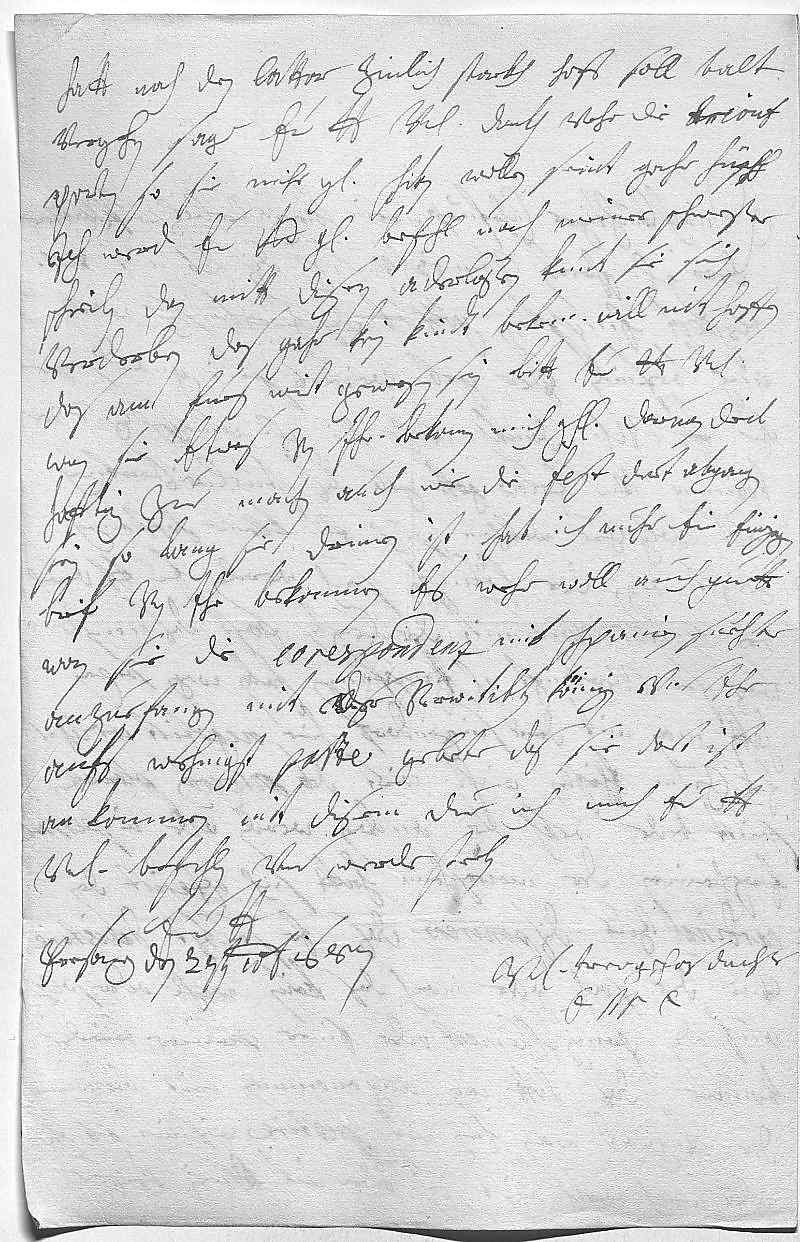 0021hatt noch den cattar zimlich starkh, hoff soll balt 0022vergehen. Sage ewer Durchlaucht vnterdehnigsten dankh vohr die trionf 0023porten, so sie mihr gnädigst schiken wollen, seint gahr hüpsch. 0024Ich werd ewer Durchlaucht gnädigsten befehl nach meiner schwester 0025schreiben, dan mitt disen aderlaßen kunt sie sich 0026verderben, das gahr kein kint bekem, will nit hoffen, 0027das am fues wirt gewesen sein. Bitt ewer Durchlaucht vnterdehnigst, 0028wan sie etwas von ihr bekomen, mich gh daruon deil- 0029hafftig zue machen, auch, wie die fest dort abgangen 0030sein. So lang sie drinen ist, hab ich nuhr ein einzigen 0031brif von ihr bekommen. Es wehr woll auch guett, 0032wan sie die corespondenz mit Schpanien suechte 0033anzuefangen mit der verwitibten Königin vnd ihr 0034aufs wehnigst parte gebete, das sie dort ist 0035an kommen. Mit disem due ich mich ewer Liebden0036vnterdehnigst befehlen vnd werde sterben 0037ewer Liebden0038vnterdehnigste trewgehorsamste dochter 0039EMT 0040Presburg den 27ten decembris 1687