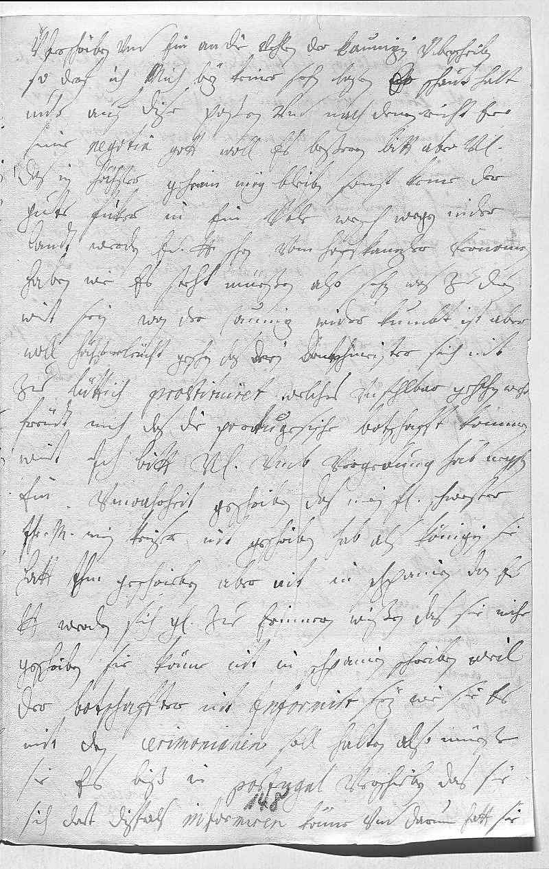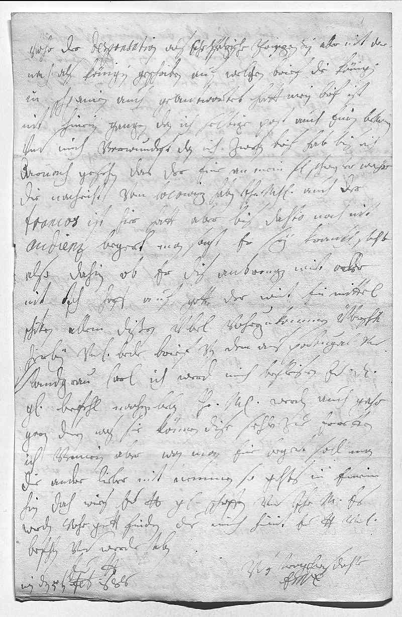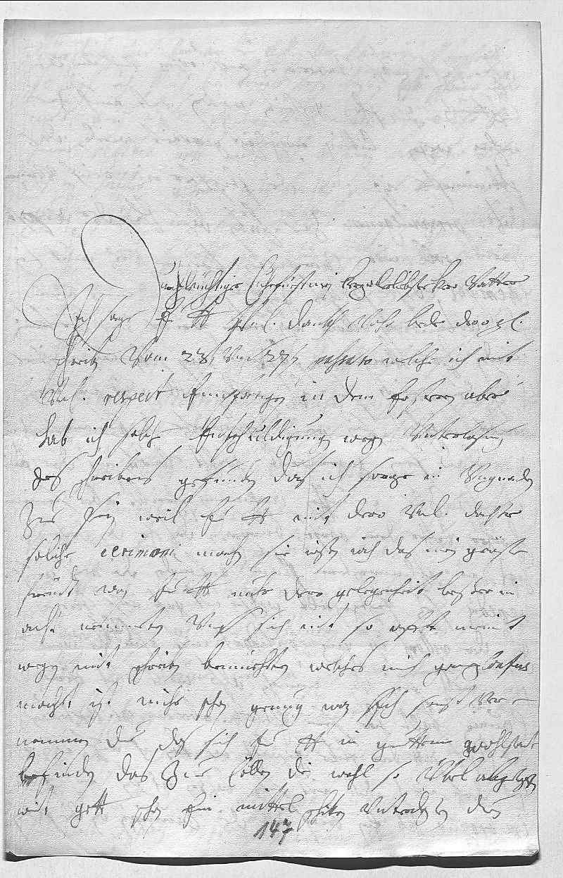 0001Durchleüchtiger Cuhrfürst, mein herzallerliebster herr vatter 0002Ich sage ewer Durchlaucht vnterdehnigsten dankh vohr bede dero gnädigste 0003schreiben vom 23ten vnd 27ten passato, welche ich mit 0004vnterdehnigstem respect empfangen. In dem ersteren aber 0005hab ich solche entschuldigungen wegen vnterlasung 0006des schreibens gefunden, das ich sorge, in vngnaden 0007zue sein, weil euer ewer Durchlaucht mit dero vnterdehnigster dochter 0008soliche cerimoni machen. Sie wißen iah, das mein gröste 0009freüdt, wan ewer Durchlaucht nuhr dero gelegenheit beßer in 0010acht nemmeten vnd sich nit so oft meinet- 0011wegen mit schreiben bemüehten, welches mich ganz confus 0012machet, ist mihr schon genug, wan ich sonst ver- 0013nemmen due, das sich ewer Durchlaucht in guettem wohlstant 0014befinden. Das zue Cöllen die wahl so übel abgeloffen, 0015wirt gott schon ein mittel schiken. Vnterdeßen duen