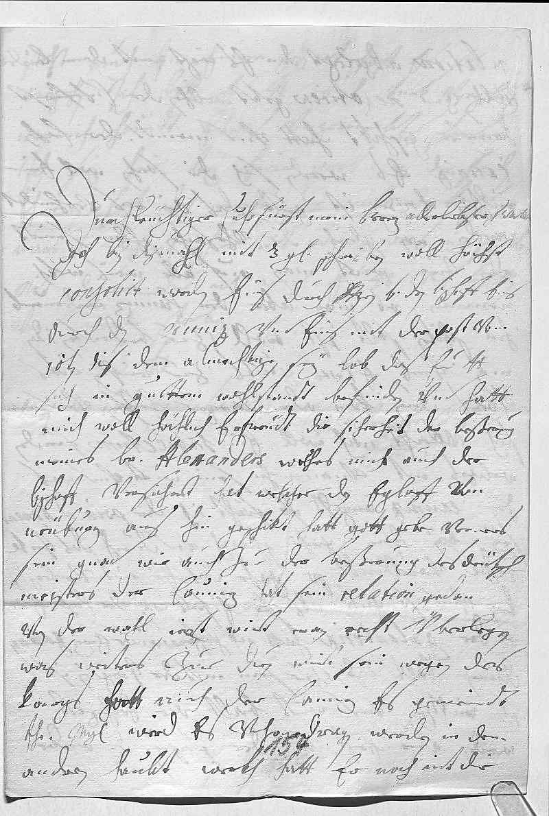 0001Durchleüchtiger Cuhrfürst, mein herz allerliebster herr vatter 0002Ich bin dismahl mit 3 gnädigen schreiben woll höchst 0003consolirt worden, eins durch mein bruder, den Bischoff, eins 0004durch den Cauniz vnd eins mit der post vom 000510ten dis. Dem almechtigen sey lob, das ewer Durchlaucht 0006sich in guettem wohlstandt befinden, vnd hatt 0007mich woll höchlich erfreüdt, die sicherheit der beßerung 0008meines bruders Alexanders, welches mihr auch der 0009Bischoff versichert hat, welcher den Egloff von 0010Neüburg aus hin geschikt hatt, gott gebe verners 0011sein gnad, wie auch zue der beßerung des Deütsch- 0012meisters . Der Cauniz hat sein relation gedan 0013von der wahl, iezt wirt man recht überlegen, 0014was weiters zue duen wirt sein. Wegen des 0015Kargs hatt auch der Cauniz es gemeindt, 0016ihr Mayestät wird es vohrgedragen werden. In dem 0017andren haubt werkh hatt er noch nit die