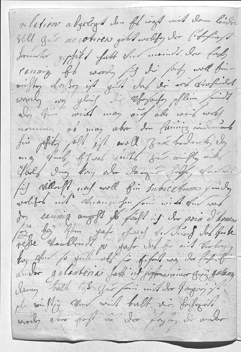 0018relation abgelegt, dan es iezt mit dem Leidel 0019vill zue negotiren gibt, welchen der Cuhrfürst 0020herunter geschikt hatt, vnd meindt der Cehn 0021Cauniz, es werden sich die sachen woll ein- 0022richten laßen. Ist guet, das die reis verhindert 0023worden, wan gleich die vhrsachen schlim seindt, 0024den Tun wirt man auf alle weis wekh 0025nemmen. Ob man aber den Cauniz widerumb 0026hin schiken solt, ist woll zue bedenken, dan 0027man vmb etwas guets zue richten niks 0028übels duen kan oder darzue helfen, vnd wirt 0029sich villeicht noch woll ein subiectum finden, 0030welches nit vnangenehm sein wirt. Vnd was 0031den Cauniz angeht, so förcht ich, der poin d'honeor 0032sey bey ihm gahr schwach vnd durch das inte- 0033resse verblendt, so gahr, das er nit verbergen 0034kan vnd so gut als sie eifert, wan der Cuhrfürst ein 0035ander galanteria hatt. Ich hoff, meiner zwey galanten 0036damen balt loß zue sein. Mit der Jorgerin ist 0037schon richtig vnd wirt balt die hochzeit 0038werden, aber erst in der fasten. Die andre