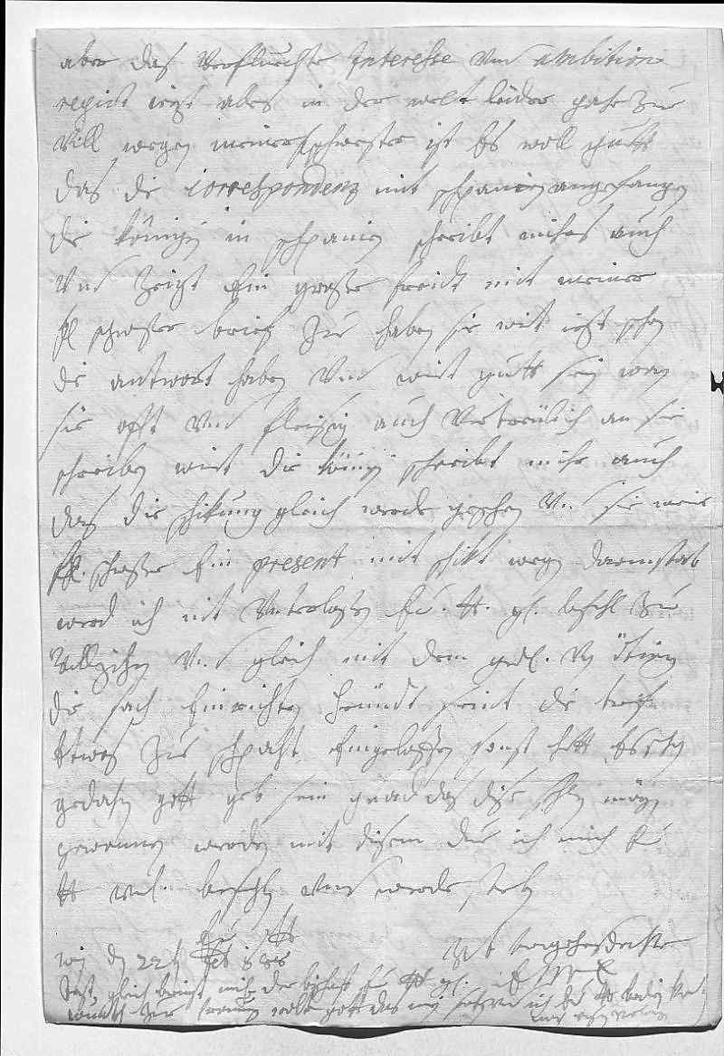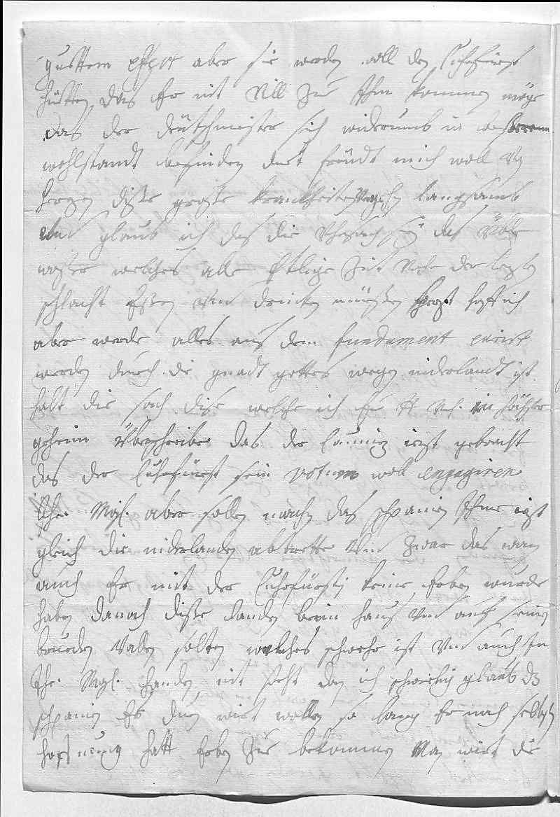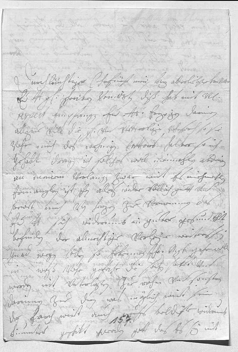 0001Durchleüchtiger Cuhrfürst, mein herz allerliebster herr vatter 0002Ewer Durchlaucht schreiben vom 13ten diß hab mit vnterdehnigstem 0003respect empfangen. Ewer Durchlaucht erzeigen darinnen 0004allzue vill die gnädige vnd vetterlige vohrsorch, so sie 0005vohr mich des wehnigen cattars halber, so ich 0006gehabt, dragen, kann ich solches woll niemahlen abdienen, 0007an meinem verlangen zwar wirt es niehmahlen 0008ermanglen. Ist schon alles wider völlich guett vnd 0009frewet mich von herzen zue vernemmen, das 0010ewer Durchlaucht sich widerumb in guter gesundtheit 0011befinden, der almechtige verleye weiters sein 0012gnad. Wegen Cöllen, so erkennen ihr Mayestät gahr woll, 0013in waß vohr gefahr die sachen steket, vnd 0014werden nit vnterlaßen zue Rohm vnd sonsten 0015darinnen zue duen, was möglich wirt sein. 0016Der Karch wirt auch aufs beldiste widerumb 0017hinunter geschikt werden, gott gebe, das es sey mit