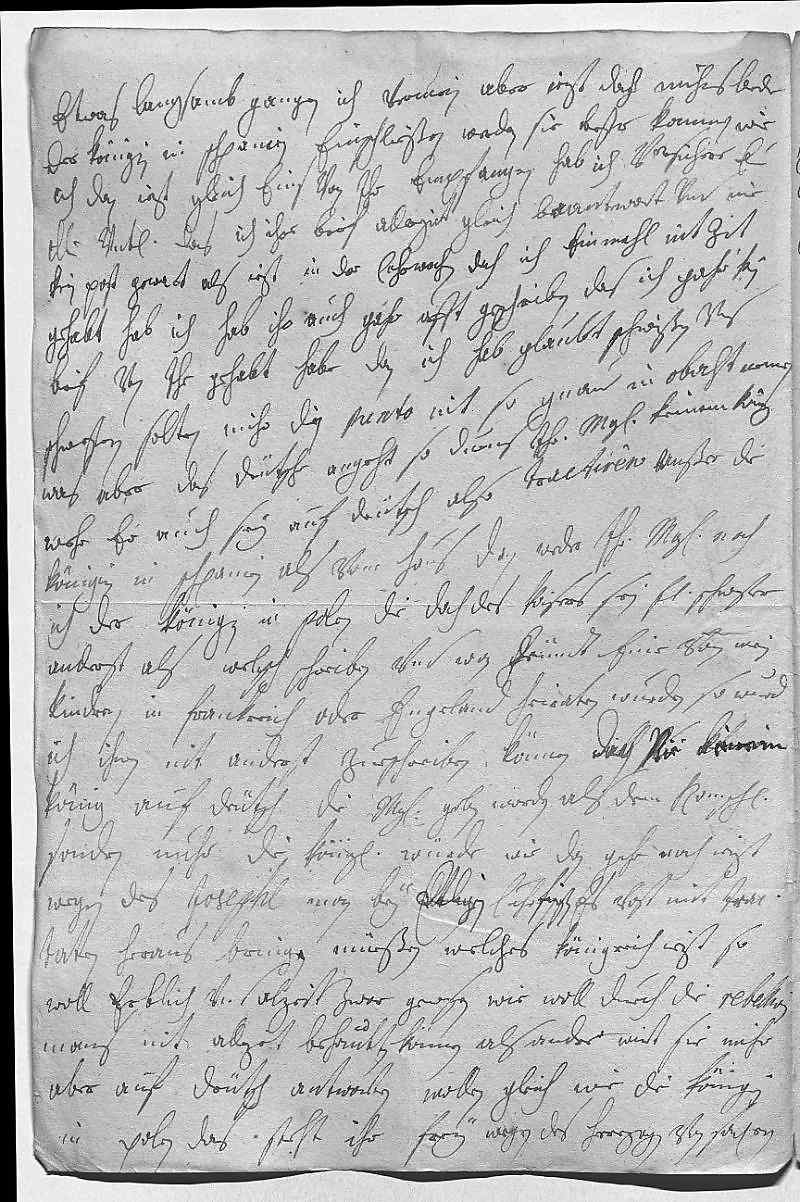0017etwas langsamb gangen. Ich vermein aber iezt, dah mihrs bede 0018der Königin in Schpanien einschließen, werden sie beßer kommen, wie 0019ich dan izt gleich eins von ihr empfangen hab. Ich versichere ewer 0020Durchlaucht vnterdehnigst, das ich ihre brief allezeit gleich beantwort vnd nie 0021kein post gewart, als izt in der cahrwochen, dah ich einmahl nit zeit 0022gehabt hab. Ich hab ihr auch gahr offt geschriben, das ich gahr kein 0023brif von ihr gehabt habe, dan ich hab glaubt, schwißen vns 0024schwestern solten mihr den punto nit so genau in obacht nemen. 0025Was aber das deütsche angeht, so duens ihr Mayestät keinem könig, 0026wehr er auch sey, auf deütsch also tractiren außer die 0027Königin in Schpanien als vom haus, dan weder ihr Mayestät noch 0028ich der Königin in Polen, die doch des Kaisers sein fraw schwester, 0029anderst als welisch schreiben, vnd wan heündt eine von mein 0030kindren in Frankreich oder Engeland heiraten wurden, so wurd 0031ich ihnen nit anderst zueschreiben können, dan nie keinem0032könig auf deütsch die mayestät geben worden als dem römischen, 0033sondren nuhr die königliche würde, wie dan gahr noch iezt 0034wegen des Josephl man bey etligen cuhrfürsten es vast mit trac- 0035taten heraus bringen müeßen, welches königreich izt so 0036woll erblich vnd alzeit zwar gewesen, wie woll durch die rebellion 0037mans nit allzeit behaubten können als andre. Wirt sie mihr 0038aber auf deütsch antworten wollen gleich wie die Königin 0039im Polen, das steht ihr frey. Wegen des Herzogen von Saxen-