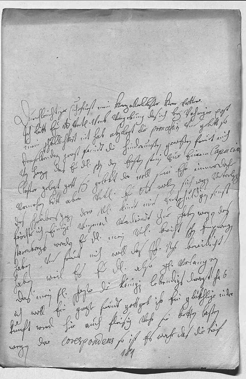 0001Durchleüchtiger Cuhrfürst, mein herzallerliebster herr vatter 0002Ich bitt ewer Durchlaucht vnterdehnigst vmb vergebung, das ich bey vohriger post 0003mein schuldichkeit nit hab abgelegt, die proncession vnd gebett, so 0004denselben dag gewest, seindt die hindernußen geweßen. Freüet mich 0005von herzen, das ewer Durchlaucht schon den ersten stein zue einem capuciner 0006closter gelegt, gott sey gelobt, der woll sein ehr immerdahr 0007vermehren. Bitt aber vnterdehnigst, ewer Durchlaucht wollen sich wegen vnterlaßung 0008des schreibens gegen dero vnterdehnigstes kindt nit entschuldigen, sonst 0009förchte ich, einige vngenad verdiendt zue haben. Wegen des 0010Starenbergs werden ewer Durchlaucht mein vnterdehnigsten bericht schon empfangen 0011haben, vnd frewet mich woll, das ihr Mayestät bewillicht 0012haben, weil es ewer Durchlaucht also gnädigst verlangen. 0013Das mein fraw schwester, die Königin, lebendigs dragt, hab 0014ich woll ein große freüdt, gott geb ihr ein glükhlige nider- 0015kunft, werd hier auch fleisig vohr sie betten laßen. 0016Wegen der corespondens, so ist es wahr, das die brif