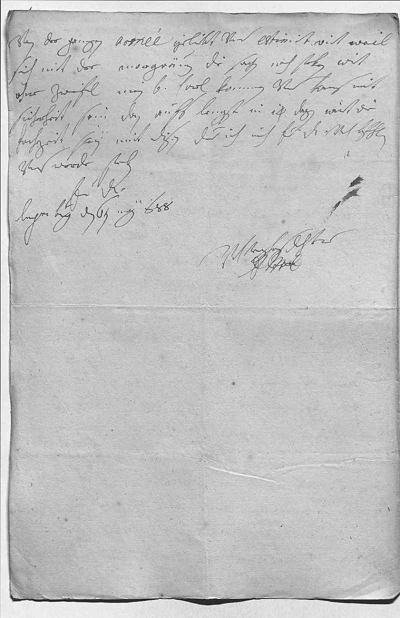 0062von der ganzen armeé geliebt vnd estimirt wirt. Weil 0063sich mit der Morgräuin die sachen noch steken, wirt 0064ohne zweifel mein bruder Carl kommen, vnd kans mit 0065sicherheit sein, dan aufs lengst in 14 dagen wirt die 0066hochzeit sein. Mit disen due ich mich ewer Durchlaucht vnterdehnigst befehlen 0067vnd werde sterben 0068ewer Durchlaucht 0069vnterdehnigste trewgehorsamste dochter 0070EMT 0071Laxenburg den 6ten maij 1688