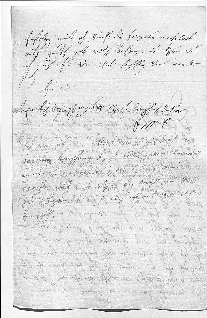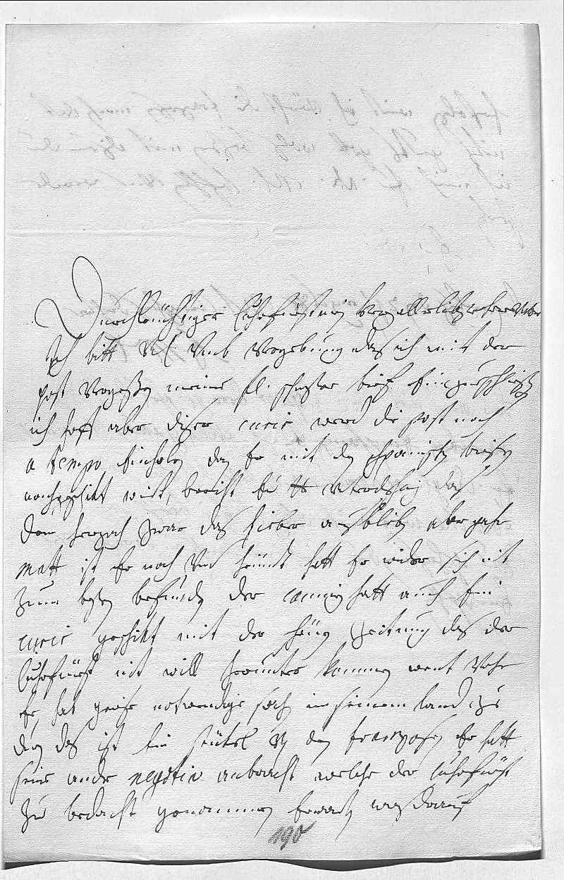 0001Durchleüchtiger Cuhrfürst, mein herzallerlibster her vatter 0002Ich bitt vnterdehnigst vmb vergebung, das ich mit der 0003post vergeßen, meiner fraw schwester brief einzueschließen, 0004ich hoff aber, diser curir werd die post noch 0005a tempo einholen, dan er mit den schpanischen brifen 0006nachgeschikt wirt. Bericht ewer Durchlaucht vnterdehnig, das 0007dem Herzoch zwar das fieber ausblieben, aber gahr 0008matt ist er noch, vnd heündt hatt er wider sich nit 0009zum besten befunden. Der Cauniz hatt auch ein 0010curir geschikt mit der schönen zeitung, das der 0011Cuhrfürst nit will herunter kommen, went vohr, 0012er hab gewise notwendige sachen in seinem land zue 0013duen, das ist ein stükel von den franzosen . Er hatt 0014seine andre negotia anbracht, welche der Cuhrfürst 0015zue bedacht genommen, erwarten, was drauf