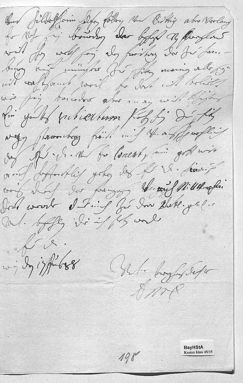 0037vnd Hildesheim helfen, Cöllen vnd Lüttig aber verlang 0038er vohr sein bruedren . Der Bischoff von Preslaw 0039wirt schon wekh sein. Den Freitag, der zue Ham- 0040burg ist, auf Münster zue schiken, meinen alle sey 0041nit rahtsamb, weil er dort nit beliebt 0042wie sein brueder . Aber man wirt ehistens 0043ein guetts subiectium suchen hin zu schiken. 0044Wegen Starenberg freüt mich vnausschprechlich, 0045das ewer Durchlaucht vnd er content sein, gott wirt 0046auch hoffentlich geben, das ewer Durchlaucht hirauf 0047reis durch der franzosen vnruh nitt verhin- 0048dert werde. Due mich zue dero vaterlichen gnade 0049vnterdehnigst befehlen, die ich sterben werde 0050ewer Durchlaucht 0051vnterdehnigste trewgehorsamste dochter 0052EMT 0053Wien den 17ten junij 1688