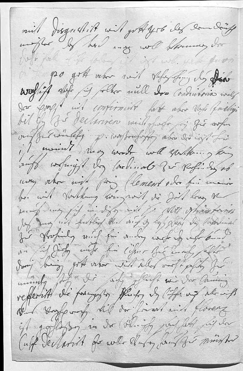 0015nit disgustirt wirt. Gottgeb, das dem Deütsch 0016Meister das bad mag woll bekommen. Der 0017doht fall Cuhr Collens ist izt woll gahr fuori 0018di tempo, gott aber wirt vohrsehung duen. Die 0019wahl ist vohr sich selber null der coadiutoria, weils 0020der Papst nit confirmirt hatt, aber vohr ineligi- 0021bil ihn zue declariren, wirt schwehr sein zue Rohm 0022auszuewürkhen. Pater Waßenhoffen aber, der iezt hier 0023ist, meindt, man werde woll vortkomen können, 0024aufs wehnigst den Cardinal zue verhindern. Ob 0025man aber mit Prinz Clement oder ein meiner 0026brüder wirt vortkomen können, wirt die zeit leren, vnd 0027mues man sich in disen nit so vill opinatriren, 0028das man nit entlich vnd auf den lesten dag den Cardinal 0029zue verhindren auch ein andren, wehr dan mehr kund 0030an sich ziehen, nuhr ein cissur zue machen, solte 0031drein bringen. Gott aber wirt alles recht schiken. Zue 0032München stehn die sachen schlecht, wie der Cauniz 0033refferirt, die franzoßen suechen den Cuhrfürst auf alle weiß zu beeinflussen0034vnd verschprechen vill. Die heirat mit Florenz 0035ist geschloßen. In der cöllnischen sach hatt sich der 0036Cuhrfürst declarirt, er wolle vnsren haus zue Münster