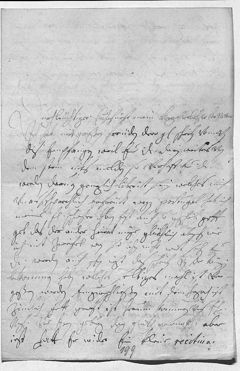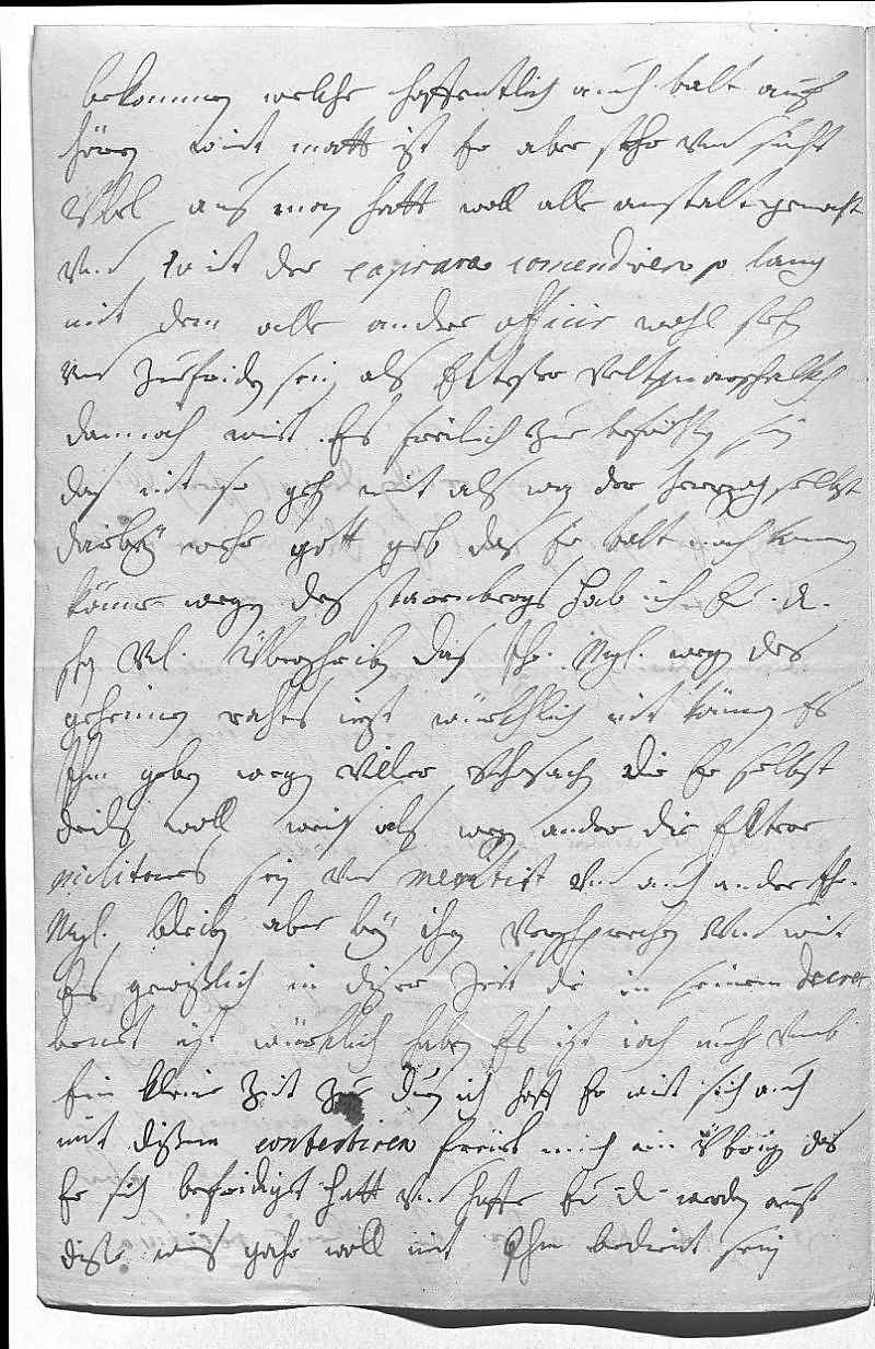 0001Durchleüchtiger Cuhrfürst, mein herzallerliebster her vatter 0002Ich hab mit großen freüden dero gnädiges schreiben vom 4ten0003dis empfangen. Weil ewer Durchlaucht darin weiters von 0004dem stein niks melden, so verhoff, ewer Durchlaucht 0005werden daruon genzlich liberirt sein, welches mich 0006vnausschprechlich erfreüdt. Wegen Portugal hab ich 0007meiner fraw schwester eben fast auch so geschriben. Gott 0008geb, das der ander heirat möge glückhlich abgehen, wie 0009ich nit zweifel, wan sie ihn nuhr wirt sehn. Ewer 0010Durchlaucht werden auch schon izt das schreiben von der Königin 0011bekommen haben, welches selbiges mahl ist ver- 0012geßen worden einzueschließen. Mit dem Herzoch ist 0013zimlich gutt gewest, ist herum kommen vnd hat ihr 0014Mayestät zue iren geburz dag glükh gewunscht, aber 0015iezt hatt er wider ein kleine recitiua