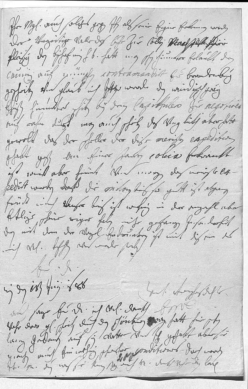 0038ihr Mayestät auch solches gegen ihn als seine eigne erkennen werden. 0039Der vnzeitige valle des Cuhrfürsten zue Cöllen macht vns hier 0040fleisig, den Bischof, mein herrn bruder, hatt man schon hinunter erlaubt, den 0041Cauniz auf Münschen contramandirt, zue Brandenburg 0042geschriben vnd glaub ich, ihr Mayestät werde den Windischgräz 0043ehisten hinunter schiken bey denen capittulen zue negotiren. 0044Auf Rohm duet man auch schreiben, das vnglükh aber hatt 0045gewolt, das der Scheller, der dise meristen expeditionen 0046gehabt, gestern an einer starken colica erkrankt 0047ist, wirt aber heünt vnd morgen das meiste ex- 0048pedirt werden. Daß die milan beis so gutt ist abgangen, 0049freüdt mich. Unser beis ist wehnig in der anzahl, aber 0050etlige schöne reiger haben mihr gefangen, insonderheit 0051den, mit dem der vogel erdrunken ist. Mit disem due 0052mich vnterdehnigst befehlen vnd werde sterben 0053ewer Durchlaucht 0054vnterdehnigste trewgehorsamste dochter 0055EMT 0056Wien den 13ten junij 16880057Auch sage ewer Durchlaucht ich vnterdehnigsten dankh 0058vohr dero gnädiges schreiben durch den Schönburg, man hatt hier schon 0059lang gedanken auf sein vatter vnd ihn gehabt, aber sie 0060machen auch ein wehnig schwehre conditiones. Doch 0061ihr Mayestät duen, was sie konen. Sag auch vnterdehnigsten dankh vohr den lax.