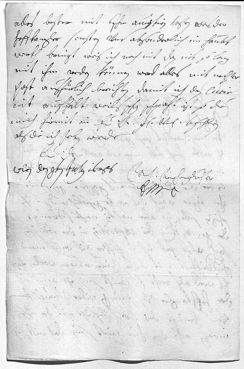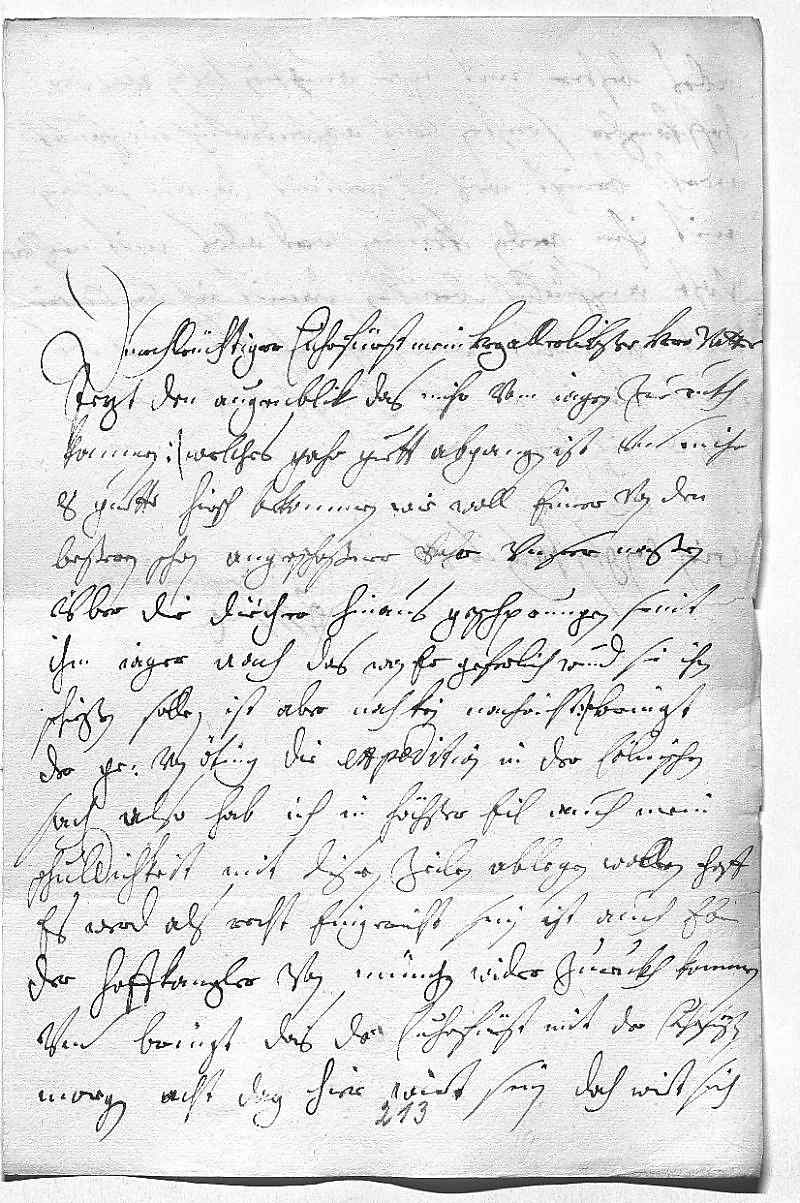 0001Durchleüchtiger Cuhrfürst, mein herzallerliebster herr vatter 0002Jezt den augenblik, das mihr vom iagen zue rukh 0003kommen (welches gahr guett abgangen ist vnd mihr 00048 guette hirsch bekommen, wie woll einer von den 0005beßeren schon angeschoßner vohr vnser naßen 0006über die düecher hinaus geschprungen. Seint 0007ihm iager nach, das wan er geferlich wurd sie ihn 0008schießen sollen, ist aber noch kein nachricht) bringt 0009der Grav von Öting die expedition in der cölnischen 0010sach, also hab ich in höchster eil auch mein 0011schuldichkeit mit disen zeilen ablegen wollen. Hoff, 0012es werd als recht eingericht sein, ist auch eben 0013der Hoffkanzler von München wider zurukh kommen 0014vnd bringt, das der Cuhrfürst mit der Cuhrfürstin 0015morgen acht dag hier wirt sein, doch wirt sich