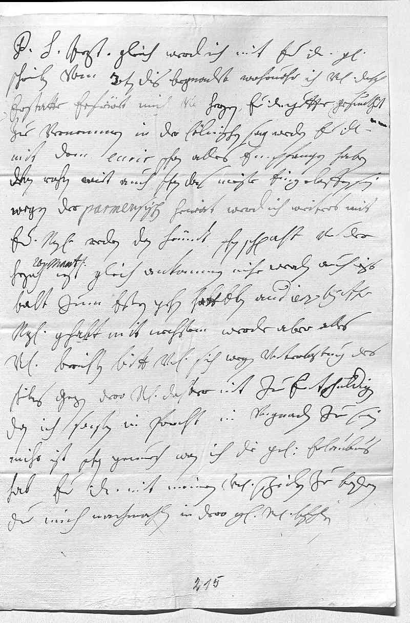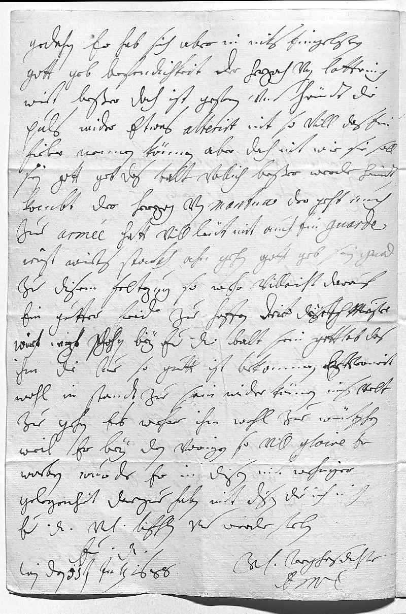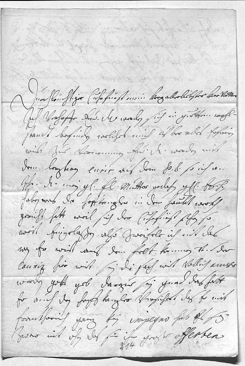 0001Durchleüchtiger Cuhrfürst, mein herzallerliebster herr vatter 0002Ich verhoffe, ewer Durchlaucht werden sich in guettem wohl- 0003standt befinden, welches mich über alles erfreüen 0004wirt zue vernemmen. Ewer Durchlaucht werden mit 0005dem lezteren curir aus dem postscriptum, so ich an 0006ihr Durchlaucht, mein geliebste fraw mutter gedahn, gh ersehen 0007haben, was der Hoffkanzler in dem haubt werkh 0008gericht hatt. Weil sich der Cuhrfürst schon so 0009weit eingelaßen, also zweifele ich nit, das, 0010wan er wirt aus dem felt kommen vnd der 0011Cauniz hier wirt sein, die sach wirt vollich aiustirt 0012werden, gott geb darzue sein gnad. Das hatt 0013er auch den Hoffkanzler versichert, das er mit 0014Frankhreich ganz kein impegno hab. Es sey 0015zwar nit ohn, das sie ihm große offerten
