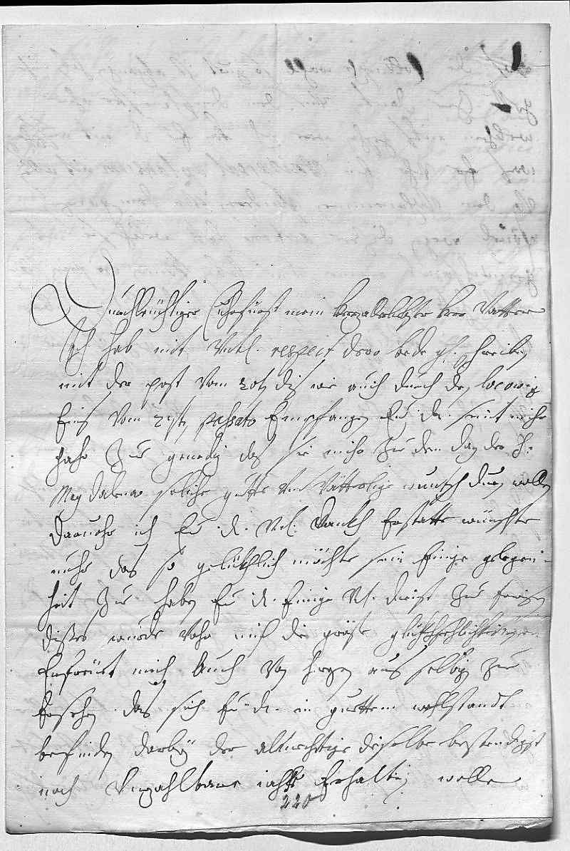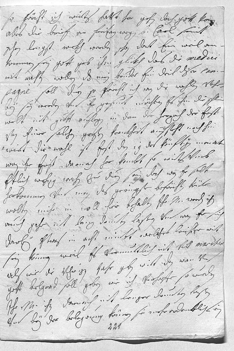 0001Durchleüchtiger Cuhrfürst, mein herzallerlibster herr vatter 0002Ich hab mit vnterdehnigstem respect dero bede gnädige schreiben 0003mit der post vom 20ten dis, wie auch durch den Locowiz 0004eins vom 27ten pasato, empfangen. Ewer Durchlaucht seint mihr 0005gahr zue genedig, das sie mihr zu dem dag der heiligen 0006Magdalena soliche gutte vnd vätterlige wuntsch duen wollen, 0007daruohr ich ewer Durchlaucht vnterdehnigst dankh erstatte. Wünschte 0008nuhr, das so gelükhlich möchte sein, einige gelegen- 0009heit zue haben, ewer Durchlaucht einige vnterdehnigste dienst zue erweisen, 0010dißes wurde vohr mich die gröste glükhsehlichkeit sein. 0011Erfreüet mich auch von herzen, aus selbigen zue 0012ersehen, das sich ewer Durchlaucht in guettem wohlstandt 0013befinden, darbey der almechtige dieselbe bestendigst 0014noch vnzahlbare iahr erhalten wolle.
