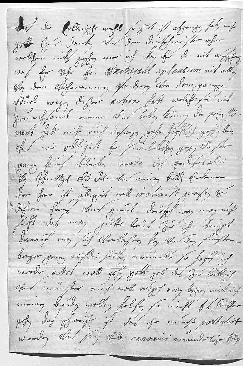 0015Das die collnische wahl so guet ist abgangen, haben mihr 0016gott zue danken vnd dem Deütschmeister, ohne 0017welchem niks geschen were. Ich kan ewer Durchlaucht nit ausschprechen, 0018was er vohr ein vniuersal aplausum nit allein 0019von dem vohrnemmen, sonderen von dem ganzen 0020pöuel wegen dißer action hatt, welche sie nit 0021genuechsamb rüemen vnd loben können. Der Prinz Cle- 0022ment hatt mihr auch deswegen gahr höfflich geschriben, 0023vnd wie obligirt er sein lebdag gegen vnser 0024ganz haus bleiben werde, das er dises allein 0025von ihr Mayestät, ewer Durchlaucht vnd meinen brudern erkenne. 0026Der herr ist allezeit woll inclinirt geweßen zu 0027dißem haus vnd guet deütsch, wan man nuhr 0028sicht, das man guette leüt zue ihm bringt, 0029darauf man sich verlaßen kan, vnd den Fürsten- 0030berger ganz auf die seiten raumbt, so, hoff ich, 0031werde alles woll gehen. Gott geb, das zue Lüttich 0032vnd Münster auch woll abgeh, wan Beyrn mit auf 0033meinen brudern wolten helfen, so möcht es leichter 0034gehen. Das schweriste ist, das er mueß postulirt 0035werden, vnd sein vill canonici wunderlige köp,