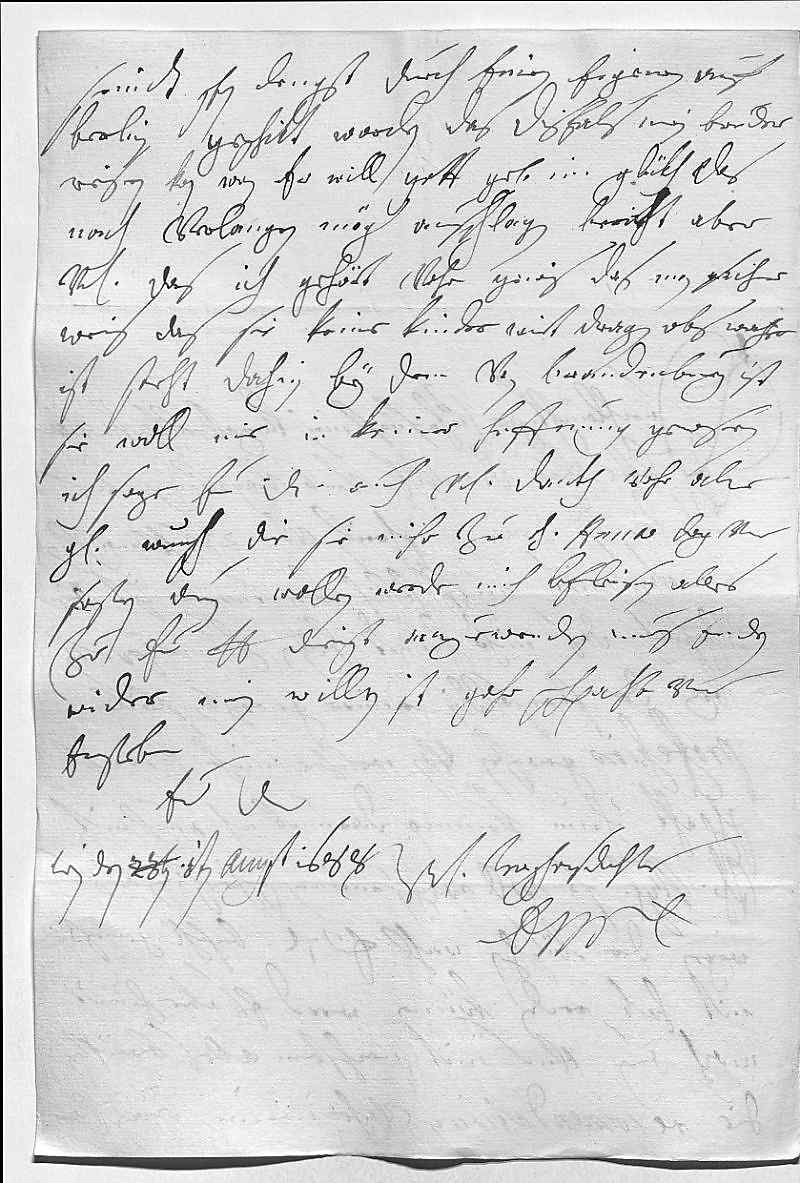 0014seindt schon lengst durch einen eigenen curier auf 0015Berlin geschikt worden, das disfals mein bruder 0016reisen kan, wan er will. Gott geb im glükh, das 0017nach verlangen mög auschlagen. Bericht aber 0018vnterdehnigst, das ich gehört vohr gewis, das man sicher 0019weis, das sie keine kinder wirt dragen, obs wahr 0020ist, steht dahin. Bey dem von Brandenburg ist 0021sie woll nie in keiner hoffnung gewesen. 0022Ich sage ewer Durchlaucht auch vnterdehnigsten dankh vohr aler 0023gnädigste wunsch, die sie mihr zu Sankt Anna dag vnd 0024sonsten duen wollen, werde mich befleisen, alles 0025zue ewer Durchlaucht dienst anzuewenden. Mues enden 0026wider mein willen, ist gahr schpaht vnd 0027ersterbe 0028ewer Durchlaucht 0029vnterdehnigste trewgehorsamste dochter 0030EMT 0031Wien den 23ten 1ten august 1688