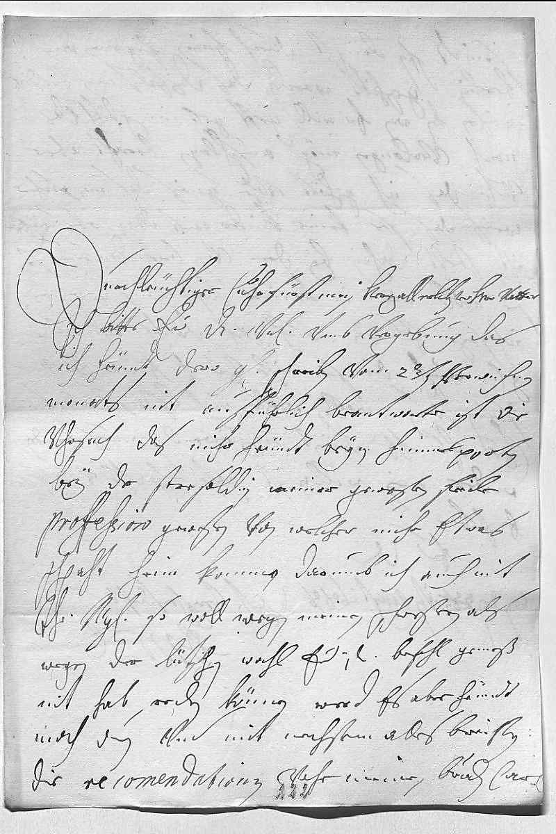 0001Durchleüchtiger Cuhrfürst, mein herzallerlibster herr vatter 0002Ich bitte ewer Durchlaucht vnterdehnigst vmb vergebung, das 0003ich heündt dero gnädiges schreiben vom 23ten verwichnen0004monats nit ausführlich beantworte. Ist die 0005vhrsach, das mihr heündt beyn Himmelporten 0006bey der Stresoldin, meiner gewesten freile, 0007proffession geweßen, von welcher mihr etwas 0008schpaht heim kommen, darumb ich auch mit 0009ihr Mayestät so woll wegen meinen schwestern als 0010wegen der lütischen wahl ewer Durchlaucht befehl gemeß 0011nit hab reden können, werd es aber heündt 0012noch duen vnd mit nechstem alles berichten. 0013Die recomendationen vohr meinen bruder Carl