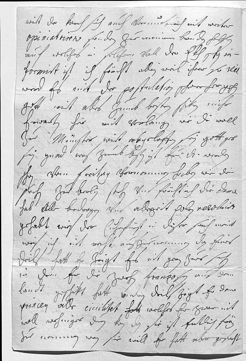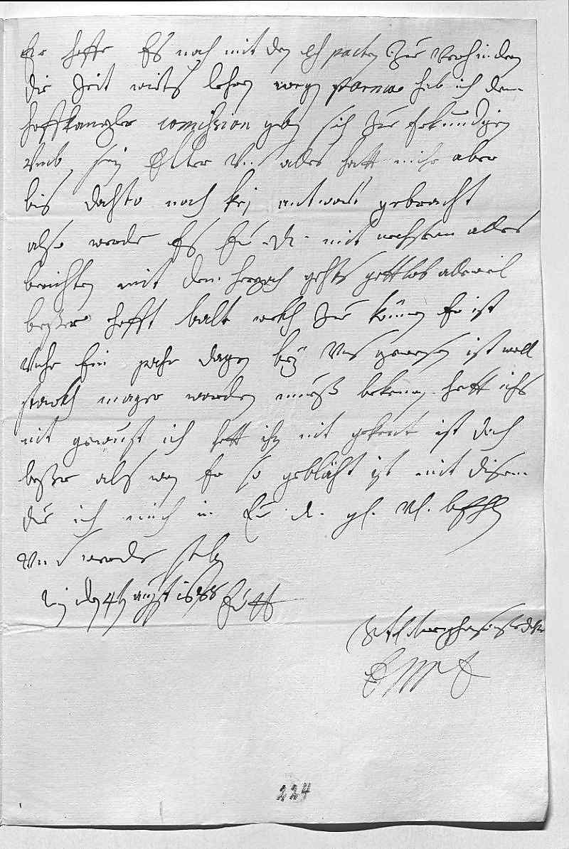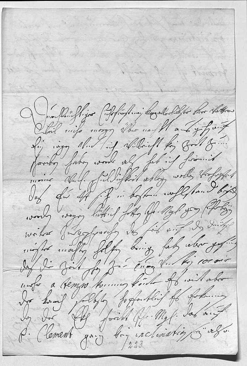 0001Durchleüchtiger Cuhrfürst, mein herzallerliebster herr vatter 0002Weil mihr morgen über nacht aus gehen auf 0003ein iagen vnd ich villeicht kein zeit zum 0004schreiben haben werde, als hab ich hiermit 0005meine vnterdehnigste schuldichkeit ablegen wollen, verhoffent, 0006das ewer Durchlaucht sich in bestem wohlstand befinden 0007werden. Wegen Lüttich hetten ihr Mayestät gern Cuhrbeyern 0008weiter zuegeschprochen, das sies auf den Deütsch 0009Meister möchten helfen bringen, haben aber gefunden, 0010das die zeit schon zue curz vnd kein courir 0011mehr a tempo kommen könte. Es wirt aber 0012der Karch selbsten hoffentlich es erkennen, 0013dan der Ekh schreibt ihr Mayestät, das auf 0014Prinz Clement ganz kein inclination sey, also