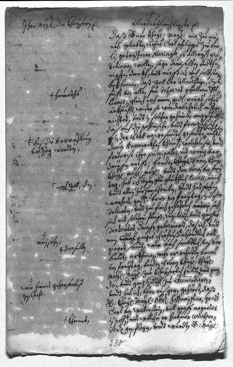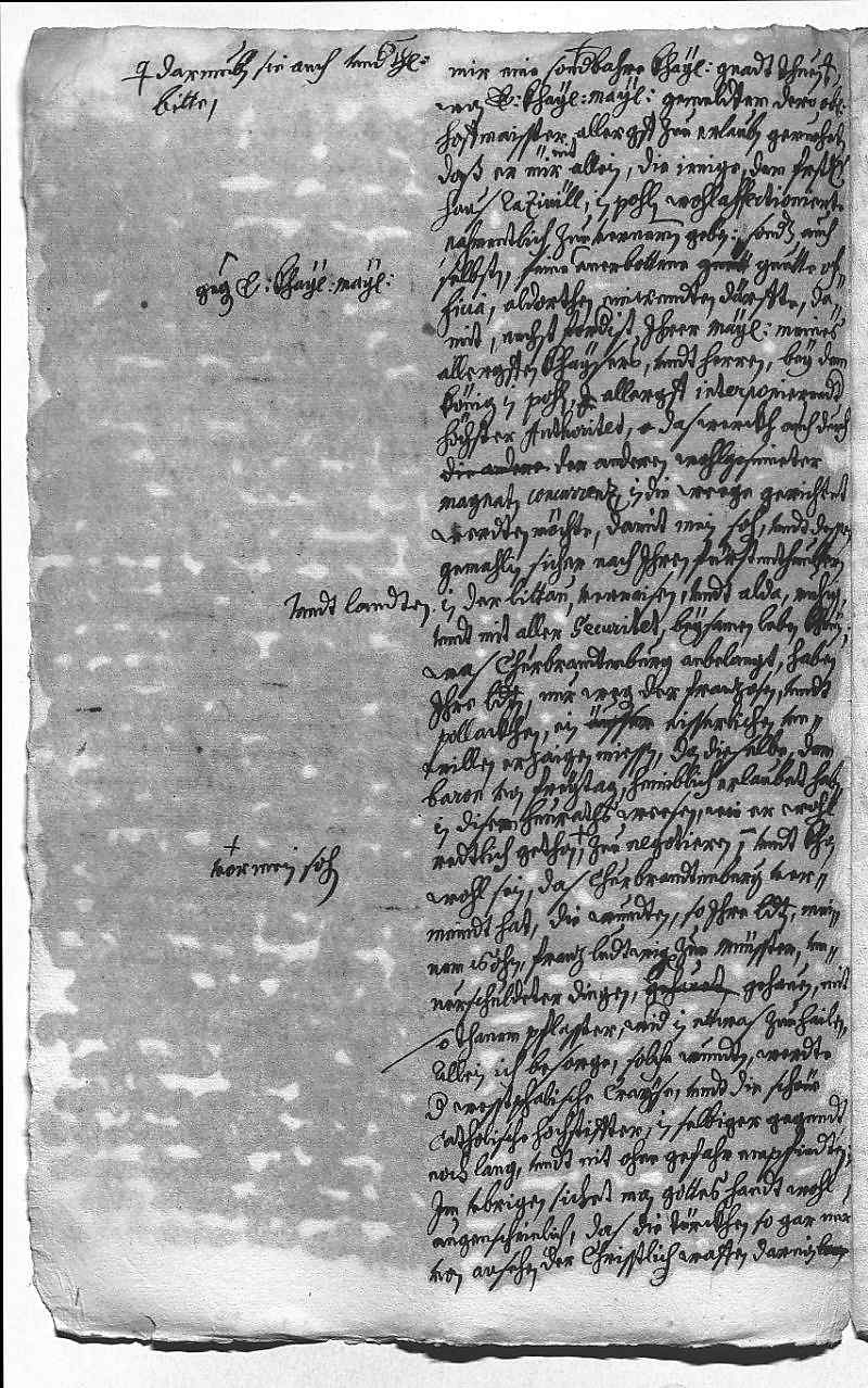 der Unterstützung der kaiserlichen Seite und des Barons Freytag . – Ist erfreut zu hören, dass der Obersthofmeister der Kaiserin, Graf Karl von Waldstein, diverse polnische Magnaten kennt, und dass dieser ihm sagen kann, wer dort dem Haus Radziwill verbunden ist. Freut sich auch, dass der Kaiser bereit ist, für den Zugriff Karl Philipps und seiner Gemahlin auf deren ererbte Besitzungen zu intervenieren. – Der Kurfürst von Brandenburg zeigt sich wohl nur wegen Polen und Frankreich erzürnt über die Eheschließung.