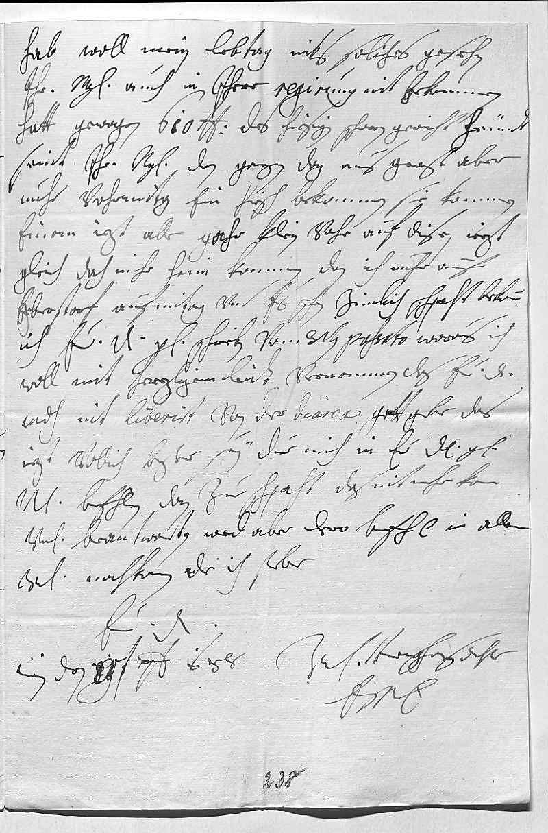0036Hab woll mein lebtag niks soliches gesehn, 0037ihr Mayestät auch in ihrer regirung nit bekommen, 0038hatt gewogen 610 pfund des hiesigen schweren gewicht. Heündt 0039seint ihr Mayestät den ganzen dag aus gewest, haben aber 0040nuhr vohrmitag ein hirsch bekommen. Sie kommen 0041einem izt alle gahr klein vohr auf disen. Iezt 0042gleich, dah mihr heim kommen, dan ich nuhr auf 0043Eberstorf auf mitag war vnd es schon zimlich schpaht ist, bekom 0044ich ewer Durchlaucht gnädiges schreiben vom 31ten passato, woraus ich 0045woll mit herzligem leidt vernommen, das ewer Durchlaucht 0046noch nit liberirt von der diarea, gott gebe, das 0047izt vollich beßer sey. Due mich in ewer Durchlaucht gnade 0048vnterdehnigst befehlen, dan es ist zue schpaht, das nit mehr kan 0049vnterdehnigst beantworten, werd aber dero befehl in allem 0050vnterdehnigst nachkomen, die ich sterbe 0051ewer Durchlaucht 0052vnterdehnigste trewgehorsamste dochter 0053EMT 0054Wien den 19ten septembris 1688