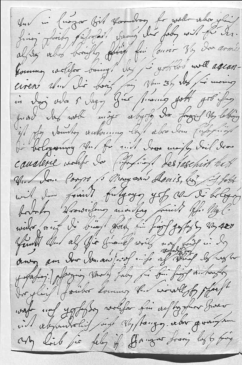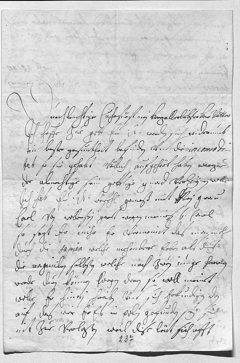 0001Durchleüchtiger Cuhrfürst, mein herzallerliebster herr vatter 0002Ich hoffe zue gott, ewer Durchlaucht werden sich widerumb 0003in bester gesuntheit befinden vnd die incomodi- 0004tet, so sie gehabt, völlich aufgehört haben, warzue 0005der almechtige sein gottlige gnad verleyen wolle. 0006Ich hab ewer Durchlaucht befehl gemeß mit mein Grau 0007Carl von Wollenstein geret wegen meines bruders Carl . 0008So sagt er mihr, er vermeindt, das man mehr 0009durch die Sapien, welche mehrendere erben, als durch 0010die Ragiuilen selbsten, welche noch zwen iunge herren, 0011werde duen können. Wegen deren so woll, meinet er, 0012wolle er hinein schreiben vnd sich erkundigen, dan 0013auf das, wie er es in Polen gefunden, sey sich 0014nit zue verlaßen, weil dise leüt sich offt