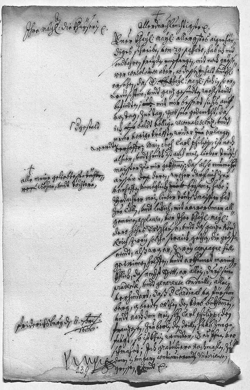 Sein Sohn Karl Philipp und dessen Gemahlin sind ebenso wie der Deutschmeister (PWs Sohn Ludwig Anton) bei PW, so dass alle seine Kinder anwesend sind. – Der Deutschmeister hat zu Köln und Lüttich Großes für das kaiserliche Haus geleistet. – Gratulation zu den Siegen in Ungarn .