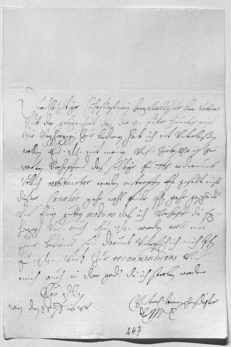0001Durchleüchtiger Cuhrfürst, mein herzallerliebster herr vatter 0002Mitt der gelegenheit, das der Grav Fuker hinunter reist, 0003die Erzherzogin zue bedienen, hab ich nit vnterlaßen 0004wollen, ewer Durchlaucht mit meinen vnterdehnigsten zeilen vnterdehnigst auf zu- 0005warten, verhoffend, das selbige ewer Durchlaucht widerumb 0006völlich restituirter werden antreffen. Es gefalt mihr 0007dißer caualier gahr wohl, finde ihn gahr gescheidt 0008vnd einen guetten modum, das ich verhoffe, die Erz- 0009herzogin vnd auch ewer Durchlaucht werden woll mit 0010ihme bediendt sein. Darumb vntersteh ich mich, ihn 0011ewer Durchlaucht vnterdehnigst zue recommendiren vnd 0012mich auch in dero gnad, die ich sterben werde 0013ewer Durchlaucht 0014vnterdehnigste trewgehorsamste dochter 0015EMT 0016Wien den 25 septembris 1688