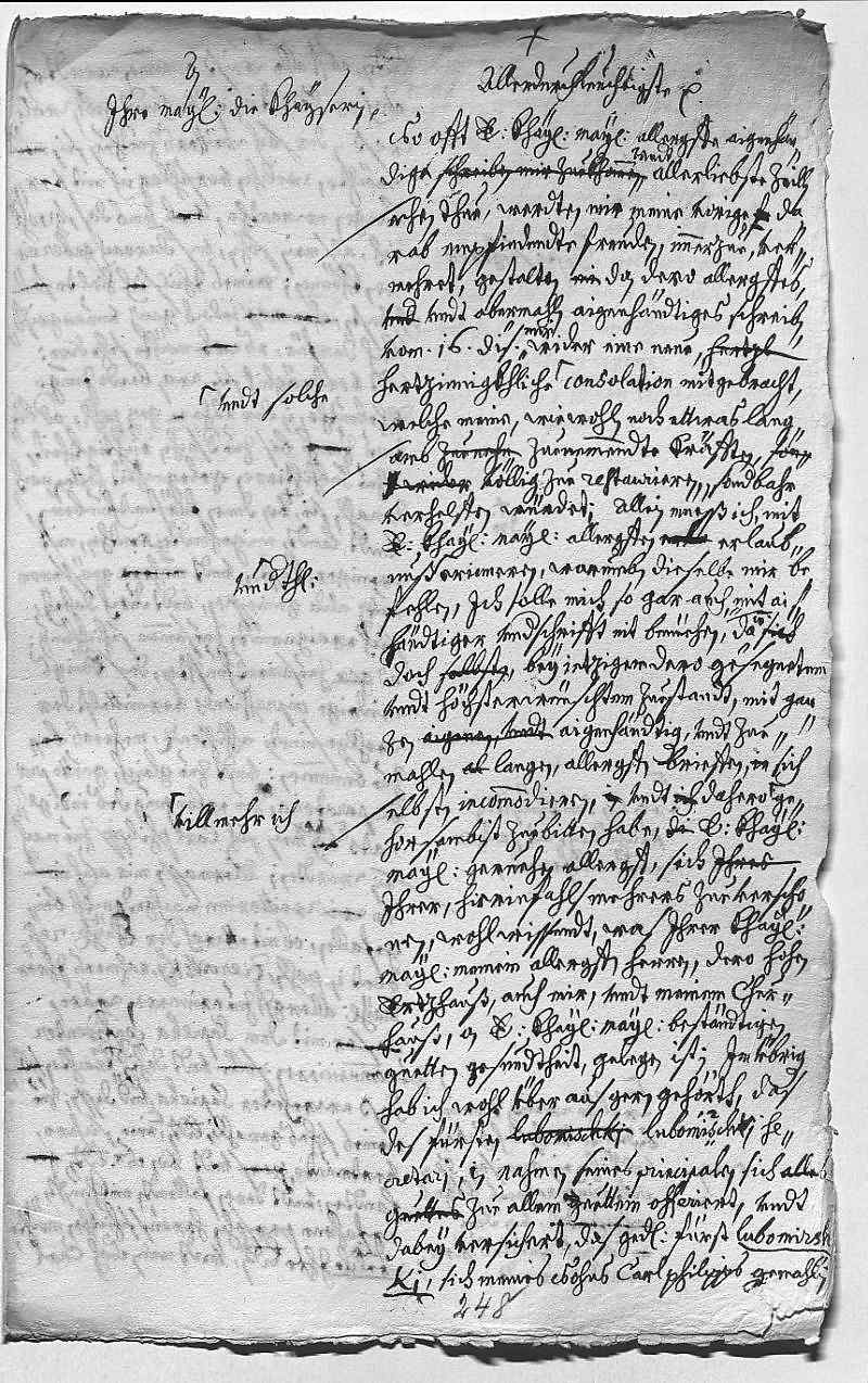 Ist erfreut über die Gesundung EMTs, die sich aber keinesfalls in ihrem derzeitigen Zustand mit eigenhändigem Schreiben bemühen möge. – Dass sich der Sekretär des Fürsten Lubomirski offeriert hat, die Angelegenheiten in Polen zu unterstützen, ist erfreulich. PW würde es begrüßen und der Sache als dienlich erachten, wenn sein Sohn Karl Philipp und dessen Gemahlin bis zur Klärung in Polen oder Litauen leben könnten, um die Verhandlungen zu vereinfachen. Hilfreich wäre es auch, wenn der kaiserliche Resident Zierowski über Sapieha erreichen könne, dass man Karl Philipps Gemahlin einen verlässlichen Sekretär aus Polen schickt, weil sie wenig vertrauenswürdige Leute um sich hat.