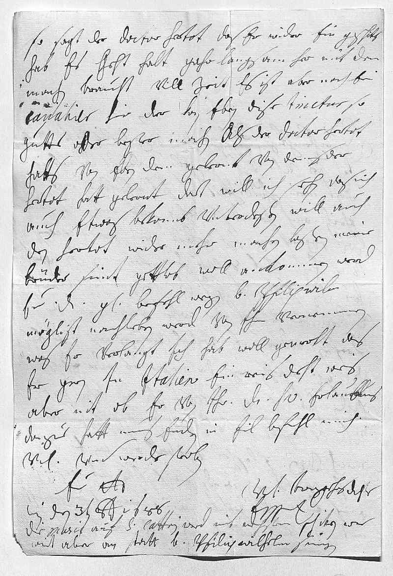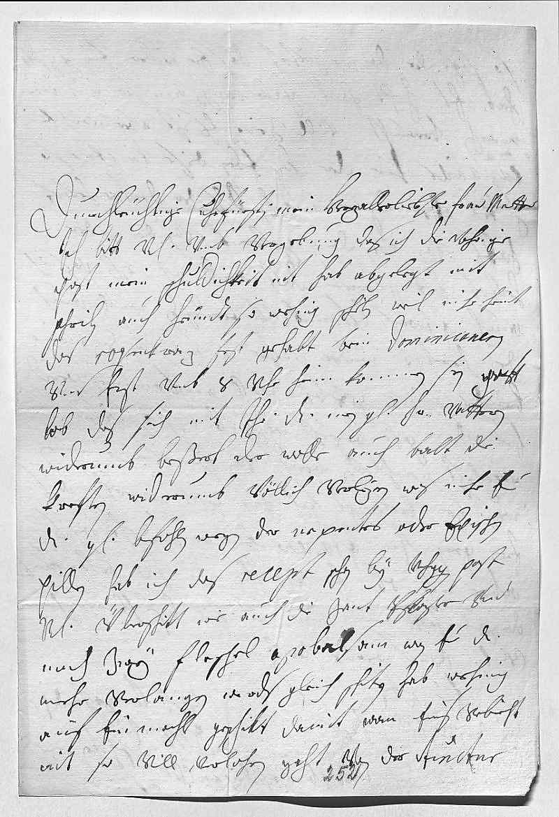 0001Durchleüchtige Cuhrfürstin, mein herzallerliebste fraw muetter0002Ich bitt vnterdehnigst vmb vergebung, das ich die vohrige 0003post mein schuldichkeit nit hab abgelegt mit 0004schreiben, auch heündt so wehnig schreiben kann, weil mihr heüdt 0005das rosenkranz fest gehabt bein dominicanern 0006vnd erst vmb 8 vhr heim kommen sein. Gott 0007lob, das sich mit ihr Durchlaucht, mein geliebsten herrn vattern, 0008widerumb beßert, der wolle auch balt die 0009kreften widerumb völlich verleyen. Was mihr ewer 0010Durchlaucht gnädigst befohlen wegen der nepentes oder exischen 0011pillen, hab ich das recept schon bey vohriger post 0012vnterdehnigst überschikt, wie auch die zant pflaster vnd 0013noch zwey fleschel apobalsam. Wan ewer Durchlaucht 0014mehr verlangen, werds gleich schiken, hab wehnig 0015auf ein mahl geschikt, damit, wan man eins verliehrt, 0016nit so vill verlohren geht. Von der tinctur,