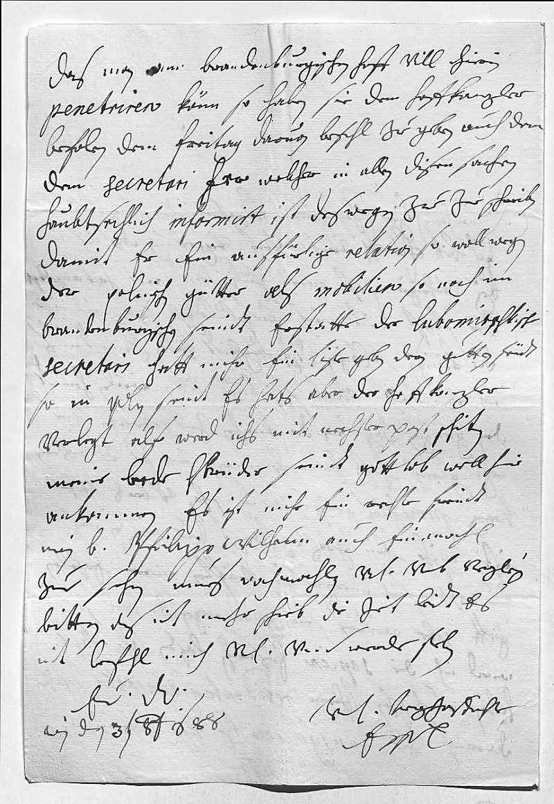 0016das man am brandenburgischen hoff vill hierin 0017penetriren könn, so haben sie dem Hoffkanzler 0018befolen, dem Freitag daruon befehl zue geben, auch dem 0019dem secretari Her, welcher in allen disen sachen 0020haubtsechlich informirt ist, deswegen zue zue schreiben, 0021darmit er ein ausfürlige relation so woll wegen 0022der polnischen güetter als mobilien, so noch im 0023brandenburgischen seindt, erstatte. Der lubomirskische 0024secretari hatt mihr ein liste geben deren gutten freündt, 0025so in Polen seint. Es hats aber der Hoffkanzler 0026verlegt, also werd ichs mit nechster post schiken. 0027Meine bede herren brüder seindt gottlob woll hir 0028ankommen, es ist mihr ein rechte freüdt, 0029mein bruder Pfilipp Wilhelm auch einmahl 0030zue sehen. Mues nochmahlen vnterdehnigst vmb vergebung 0031bitten, das nit mehr schreib, die zeit leidt es 0032nit. Befehl mich vnterdehnigst vnd werde sterben 0033ewer Durchlaucht 0034vnterdehnigst dochter 0035EMT 0036Wien den 3ten octobris 1688