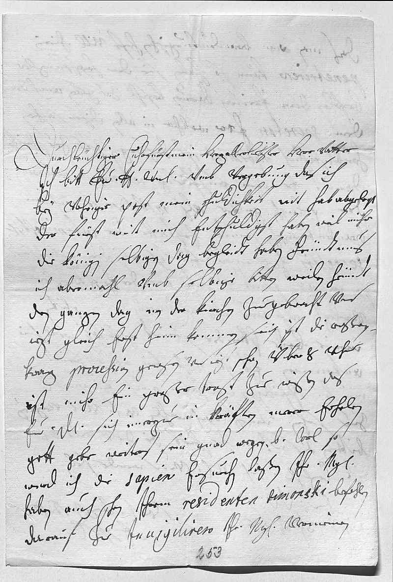 0001Durchleüchtiger Cuhrfürst, mein herzallerliebster herr vatter 0002Ich bitt ewer Durchlaucht vnterdehnigst vmb vergebung, das ich 0003bey vohriger post mein schuldichkeit nit hab abgelegt, 0004der Fürst wirt mich entschuldigst haben, weil mihr 0005die Königin selbigen dag begleidt haben. Heündt mus 0006ich abermahl vmb selbige bitten, weilen heündt 0007den ganzen dag in der kirchen zuegebracht vnd 0008izt gleich erst heim kommen sein, ist die roßen- 0009kranz procession gewesen, vnd izt schon über 8 vhr. 0010Ist mihr ein großer trost zue wißen, das 0011ewer Durchlaucht sich immerzue in kräften merer erholen, 0012gott gebe weiters sein gnad. Wegen bruder Carl, so 0013werd ich die Sapien ersuechen laßen, ihr Mayestät 0014haben auch schon ihrem residenten Simonski befohlen, 0015darauf zue inuigiliren. Ihr Mayestät vermeinen,