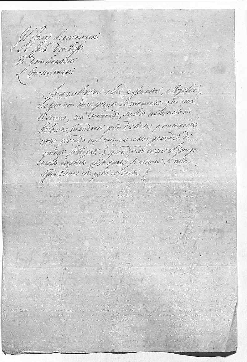0066il Conte Sieniauuski 0067la casa Denhoff 0068il Dombrouuski 0069l'Onzkovonski 0070Sono moltissimi altri, e Senatori, e popolari, 0071che per non àuer piena la memoria, qui non 0072li scriuo, mà occovendo, subito ritornato in 0073Polonia, mandarei più distinta, e numerota 0074nota essendo un numero assai grande di 0075questi colligati & racordando essere il tempo 0076molto angusto ??? il quale si ricerca la mia 0077spedizione con ogni celerita. &