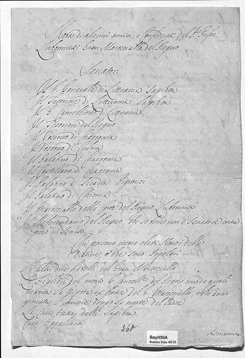 0041Nota di alcuni amici, e confederati del ??? Principe 0042Lubomirski Gran Maresciallo del Regno 0043Senatori 0044il G Generale die Littuania Sapihea 0045il Tesoriere di Littuania Sapihea 0046il G Cancelliere di Littuania 0047il Tesoriere del regno 0048il Vescouo di Craccouia 0049il Vescouo di Culma 0050il Palatino di Craccouia 0051il Castellano di Craccouia 0052il Palatino di Siradia Pignonzi 0053il Palatino di Chionia 0054il Maresciallo della corte del regno Lubomirski 0055il Referendario del regno, che se bene non è Senatore enna 0056però in senato 0057Chi possono essere eletti nonzi delle 0058dictine, è che sono popolari 0059li altri due fratelli del Gran Maresciallo 0060li figlioli del morto G Cancelliere del regno, uno de quali 0061marita la nipote ex fratre del Gran Maresciallo, e che ànno 0062giurata l'unione doppo la morte del padre 0063la casa tutta delli Sapihea 0064casa Oppalinski 0065Liemannski