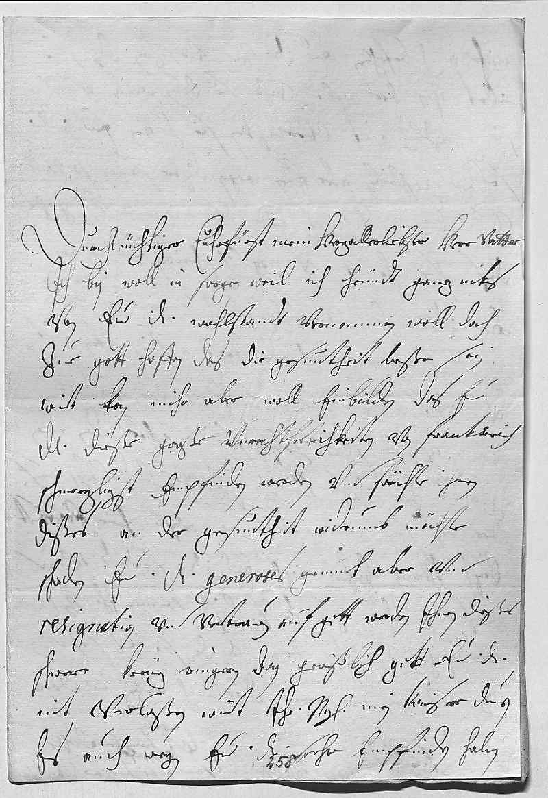 0001Durchleüchtiger Cuhrfürst, mein herzallerliebster herr vatter 0002Ich bin woll in sorgen, weil ich heündt ganz niks 0003von ewer Durchlaucht wohlstandt vernommen, woll doch 0004zue gott hoffen, das die gesuntheit beßer sein 0005wirt. Kan mihr aber woll einbilden, das ewer 0006Durchlaucht dieße große vnrechtfertichkeiten von Frankreich 0007schmerzligst emfinden werden, vnd förchte, dass ihnen 0008dißes an der gesuntheit widrumb möchte 0009schaden. Ewer Durchlaucht generoses gemüet aber vnd 0010resignation vnd vertrawen auf gott werden ihnen dießes 0011schwere kreüz ringern, dan gewißlich gott ewer Durchlaucht 0012nit verlaßen wirt. Ihr Mayestät, mein Kaiser, duen 0013es auch wegen ewer Durchlaucht sehr empfinden, haben