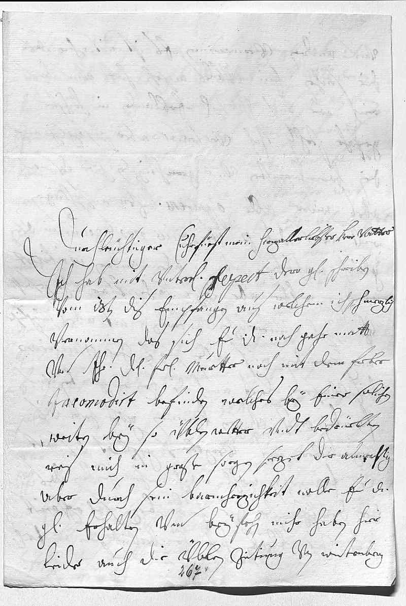 0001Durchleüchtiger Cuhrfürst, mein herzallerliebster herr vatter 0002Ich hab mit vnterdehnigstem respect dero gnädiges schreiben 0003vom 13ten dis empfangen, aus welchem ich schmerzlich 0004vernommen, das sich ewer Durchlaucht noch gahr matt 0005vnd ihr Durchlaucht fraw muetter noch mit dem fieber 0006incomodirt befinden, welches bey einer solichen 0007weiten, bey so üblen wetter vndt bedrüebten 0008reis mich in große sorgen sezet, der almechtige0009aber durch sein barmherzichkeit wolle ewer Durchlaucht 0010gnädig erhalten vnd beystehn. Mihr haben hier 0011leider auch die üblen zeitung von Wirtenberg