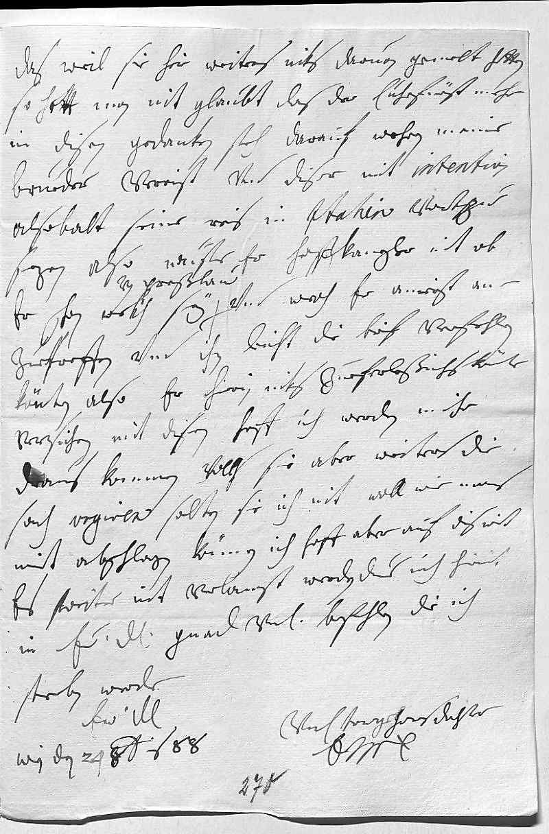 0031das, weil sie hir weiters niks daruon gemelt hetten, 0032so hett man nit glaubt, das der Cuhrfürst mehr 0033in disen gedanken steh, darauf wehren meine 0034brueder vereist vnd diser mit intention, 0035alsobalt seine reis in Italien vortzue- 0036sezen. Also wüste er Hoffkanzler nit, ob 0037er schon wekh sey von Preßlaw vnd woh er aniezt an- 0038zuetreffen, vnd dass ihn leicht die brif verfehlen 0039könten, also er hierin niks zueferleßichs könte 0040versichern. Mit disen, hoff ich, werden mihr 0041draus kommen. Vals sie aber weiters die 0042sach vrgiren solten, sie ich nit woll, wie mans 0043wirt abschlagen können, ich hoff aber, auf dis wirt 0044es weiter nit verlangt werden. Due mich hirmit 0045in ewer Durchlaucht gnad vnterdehnigst befehlen, die ich 0046sterben werde 0047ewer Durchlaucht 0048vnterdehnigste trewgehorsamste dochter 0049EMT 0050Wien den 24 octobris 1688