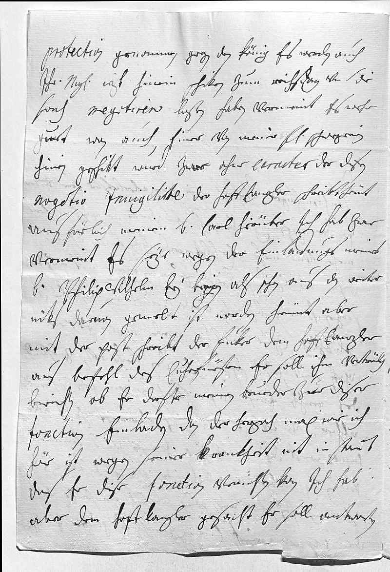0014protection genommen gegen den König . Es werden auch 0015ihr Mayestät iezt hinein schiken zum reichsdag vnd die 0016sach negotiren laßen. Sie haben vermeint, es wehr 0017guet, wan auch einer von meiner fraw schwegerin 0018hinein geschikt wurd, zwar ohne caracter, der disen 0019negotio inuigilirte. Der Hoffcanzler schreibt heünt 0020aus förlich meinem bruder Carl hierüber. Ich hab zwar 0021vermeint, es sey wegen der einladungs meines 0022bruders Pfilip Wilhelm bey Beyern als schon aus, dan weiter 0023niks daruon gemelt ist worden, heünt aber 0024mit der post schreibt der Fuker dem Hoffcanzler 0025aus befehl des Cuhrfürsten, er soll ihm vertreülich 0026berichten, ob er derfte meinen brueder zue diser 0027fonction einladen, dan der Herzoch Max, wie ich 0028hör, ist wegen seiner krankheit nit in stant, 0029das er dise fonction verichten kan. Ich hab 0030aber dem Hoffkanzler gesacht, er soll antworten,