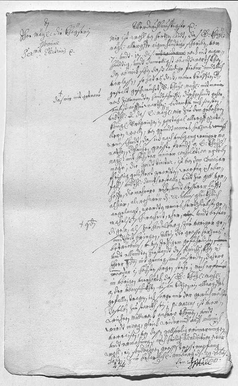 Elisabeth Amalie (EMTs Mutter) entschuldigt sich, dass sie wegen Krankheit noch nicht selbst schreiben kann und dankt für die Nachricht von der Geburt des portugiesischen Erbprinzen und die vom Kurier überbrachte Goldtinktur. – Am 22. Oktober sind sie in Neuburg eingetroffen, wo die Ruhe auch dem Kurfürsten sicher guttun wird, obwohl die Lage in Heidelberg und im Reich ihn sehr betrübt. – Ist erfreut, dass EMT die Bisamkatze gefällt und hofft, der Geruch werde nicht zu stark sein. – Von Pater Marco hat man großen Trost empfangen, aber er wird morgen weiter nach München reisen.