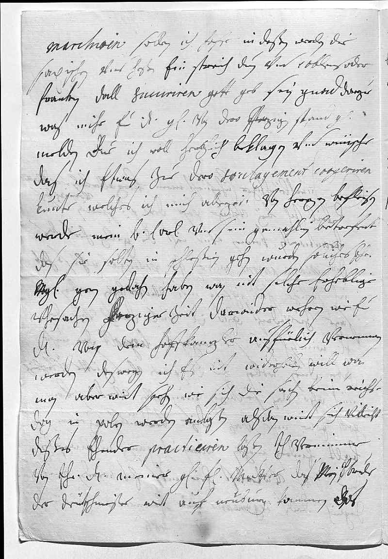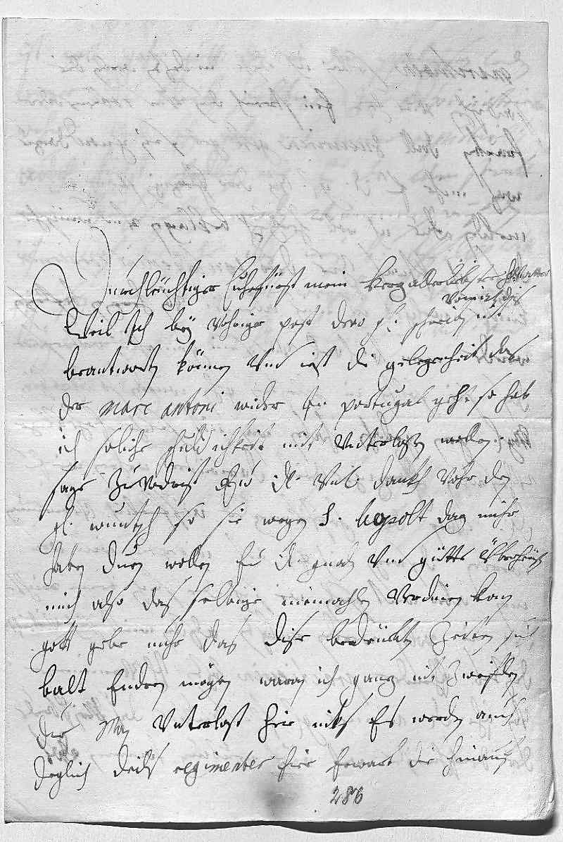 0001Durchleüchtiger Cuhrfürst, mein herzallerliebster herr vatter 0002Weil ich bey vohriger post dero gnädiges schreiben vom 12ten dis nit 0003beantworten können vnd izt die gelegenheit, das 0004der Marc Antoni wider in Portugal geht, so hab 0005ich soliche schuldichkeit nit vnterlaßen wollen. 0006Sage zuevordrist ewer Durchlaucht vnterdehnigst dankh vohr den 0007gnädigen wuntsch, so sie wegen Sankt Leopolt dag mihr 0008haben duen wollen, ewer Durchlaucht gnaden vnd gütte überheüfen 0009mich also, das ich selbige niemahlen verdinen kan. 0010Gott gebe nuhr, das dise bedrüebten zeiten sich 0011balt endren mögen, waran ich ganz nit zweiflen 0012due. Man vnterlast hier niks, es werden auch 0013däglich deils regimenter hier erwart, die hinauf