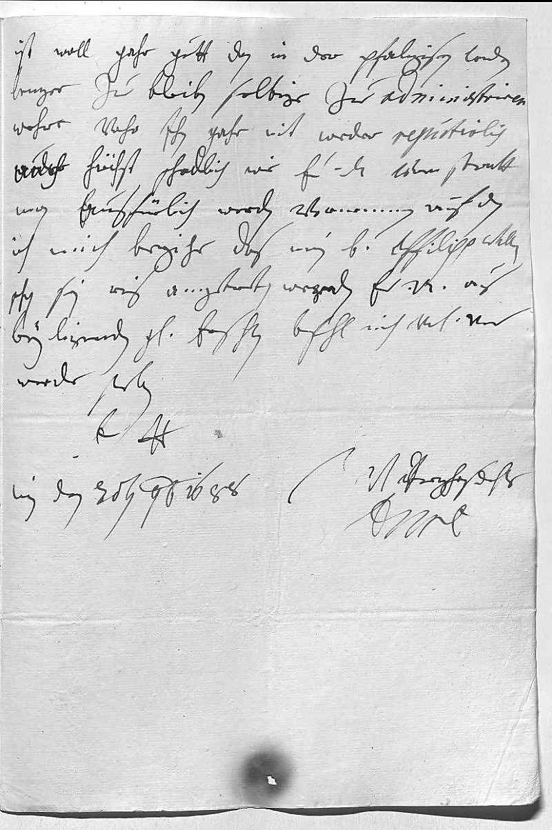 0032ist woll gahr gutt, dan in der pfalzisen lendern 0033lenger zue bleiben selbige zue administriren, 0034wehre vohr ihn gahr nit weder reputirlich, 0035auch höchst schadlich, wie ewer Durchlaucht vom Stratt- 0036man ausfürlich werden vernemmen, auf den 0037ich mich bezihe. Das mein bruder Pfilipp Willem 0038schon sein reis angetreten, werden ewer Durchlaucht aus 0039bey ligenden gnädigst ersehen. Befehl mich vnterdehnigst vnd 0040werde sterben 0041ewer Durchlaucht 0042vnterdehnigste trewgehorsamste dochter 0043EMT 0044Wien den 20ten novembris 1688