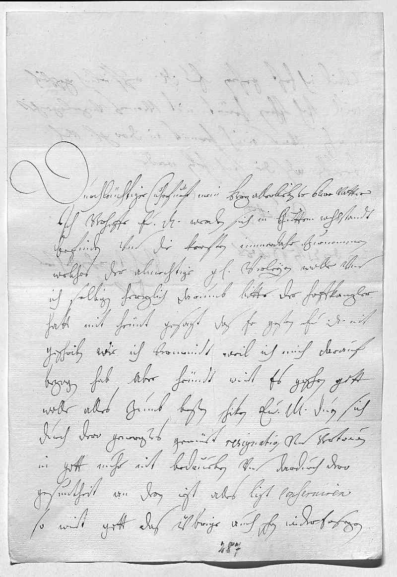 0001Durchleüchtiger Cuhrfürst, mein herzallerliebster herr vatter 0002Ich verhoffe, ewer Durchlaucht werden sich in guettem wohlstandt 0003befinden vnd die kreften immerdahr zuenemmen, 0004welches der almechtige gnädigst verleyen wolle vnd 0005ich selbigen herzlich darumb bitte. Der Hoffkanzler 0006hatt mit heünt gesagt, das er gestern ewer Durchlaucht nit 0007geschriben, wie ich vermeindt, weil ich mich darauf 0008bezogen hab, aber heündt wirt es geschen, gott 0009wolle alles zumb besten schiken. Ewer Durchlaucht duen sich 0010durch dero generoßes gemüet, resignation vnd vertrawen 0011in gott nuhr nit bedrüeben vnd dardurch dero 0012gesuntheit, an deren izt alles ligt, conseruiren, 0013so wirt gott das übrige auch schon wider ersezen.