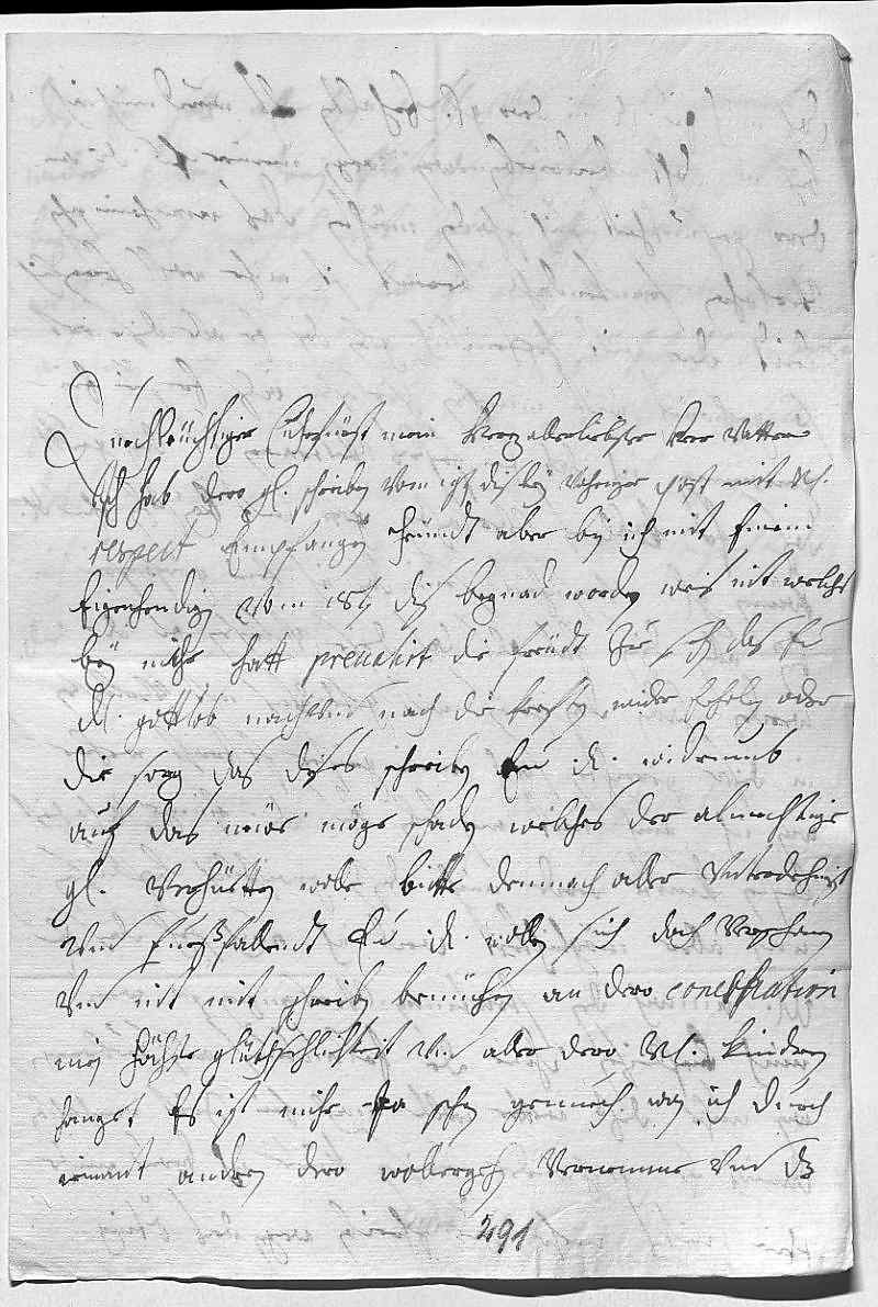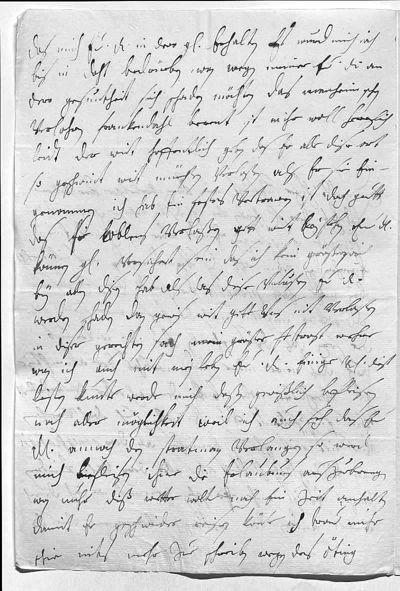 0001Durchleüchtiger Cuhrfürst, mein herzallerliebster herr vatter 0002Ich hab dero gnädiges schreiben vom 19ten dis bey vohriger post mit vnterdehnigstem 0003respect empfangen, heündt aber bin ich mit einem 0004eigenhendigen vom 18ten dis begnad worden. Weis nit, welchs 0005bey mihr hatt preualirt, die freüdt zue sehen, das ewer 0006Durchlaucht gottlob nachvnd nach die kreften wider erholen, oder 0007die sorg, das dises schreiben ewer Durchlaucht widrumb 0008auf das newe möge schaden, welches der almechtige 0009gnädig verhüetten wolle. Bitte demnach aller vnterdehnigst 0010vnd fueßfallendt, ewer Durchlaucht wollen sich doch verschonen 0011vnd nit mit schreiben bemüehen, an dero conseruation0012mein höchste glükhsehlichkeit vnd aller dero vnterdehnigsten kindren 0013hanget. Es ist mihr ia schon genuech, wan ich durch 0014iemant andren dero wollergehn vernemme, vnd das
