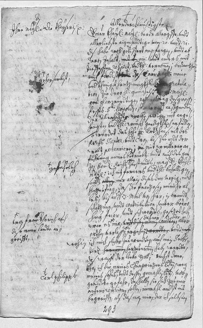 Hat erfreut vernommen, dass Kaiser Leopold I. seine Glückwünsche zum Leopoldi-Fest gnädig aufgenommen hat. – Über seine schwierige Lage will PW gar nichts mehr schreiben, nur, dass die Franzosen mittlerweile alles bis auf eine Entfernung von drei Meilen auf Neuburg besetzt haben und mit Brandschatzung und Kontribution belegen. – Den Vorschlag des Kurprinzen (PWs Sohn Johann Wilhelm), dass PWs Sohn Karl Philipp und dessen Gemahlin sich wegen angeblicher Gefahr zu PW begeben sollten, kann er nicht anders verstehen, als dass man ihm trotz seiner schwierigen Lage auch diese Last noch anhängen will. Er wird sie gerne aufnehmen, weiß aber nicht, wie lange er für seinen eigenen Unterhalt und den so vieler Kinder aufkommen kann. Dabei sei Düsseldorf viel sicherer, zumal dort auch Truppen zur Verfügung stehen. – Wegen der polnischen Angelegenheiten wird der Schellerer das, was PW ihm heute geschrieben hat, EMT vortragen. – Den Deutschmeister (PWs Sohn Ludwig Anton) hat er in Heidelberg nur deshalb als Vertreter zurückgelassen, damit die Bürgerschaft sich nicht ganz verlassen fühle. Wegen der Sicherheit des Deutschmeisters hat er seinen Geheimen Rat und Hofmarschall von Steinkallenfels instruiert. – PWs Sohn Philipp Wilhelm ist von Breslau aus in Neuburg eingetroffen und wird übermorgen seine Reise nach Italien beginnen. – Sein Sohn Friedrich Wilhelm ist in München überaus höflich behandelt worden. – Von Amtsträgern aus Heidelberg hat PW gehört, dass der verwitweten Kurfürstin von der Pfalz von kaiserlicher Seite eine sehr erhebliche Summe ausgezahlt worden sei.