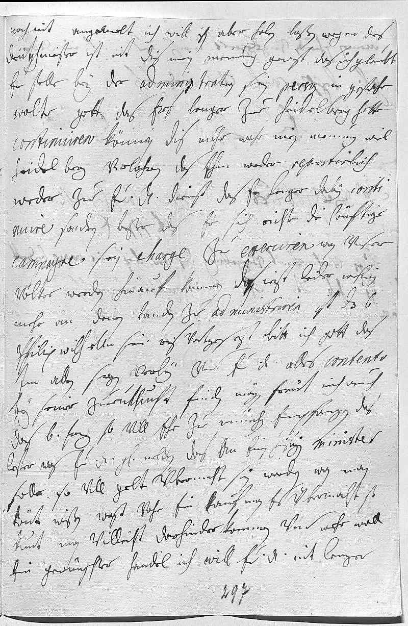 0039noch nit angemelt, ich will ihn aber holen laßen. Wegen des 0040Deütschmeister ist nit dis mein meinung gewest, das ich glaubt, 0041er stelle bey der administration sein person in gefahr, 0042wolte gott, das ers lenger zue Heidelberg hette 0043continuiren können. Dis nuhr wahr mein meinung, weil 0044Heidelberg verlohren, das es ihm weder reputirlich, 0045weder zue ewer Durchlaucht dienst wäre, das er lenger dabey conti- 0046nuire, sondern beßer, das er sich richte, die cönftige 0047campagne sein charge zue exerciren, wan vnser 0048völker werden hinauf kommen, dan iezt leider wehnig 0049mehr an denen landen zu administriren ist. Das bruder 0050Pfilip Wilhellm sein reis vortgesezt, bitt ich gott, das 0051im allen segen verley vnd ewer Durchlaucht alles contento 0052bey seiner zurukhunft finden mögen. Freüt mich auch, 0053das bruder Franz so vill ehr zue München empfangen. Das 0054lester, was ewer Durchlaucht gnädigst melden, das an einen hisigen minister 0055solle so vill gelt übermacht sey worden, wan man 0056könt wißen, waß vohr ein kauf man es übermacht, so 0057kunt man villeicht darhinder kommen vnd wehr woll 0058ein gewünschter handel. Ich will ewer Durchlaucht nit lenger