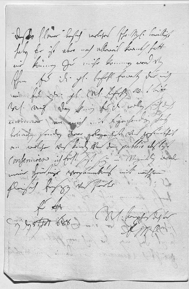 0013desto clarer besteh, welches ihr Mayestät bewilligt 0014haben. Er ist aber noch alleweil krankh, hatt 0015nie können zue mihr kommen, werd von 0016ihm ewer Durchlaucht gnädigsten befehl erwarten. Due mich 0017in ewer Durchlaucht gnade vnterdehnigst befehlen vnd bitt 0018vnterdehnigst auf den knien, ewer Durchlaucht wollen sich doch 0019nimmer an mich mit eigenhendigen schreiben 0020bemühen, sondern dero gelegenheit vnd gesuntheit, 0021an welcher vns kindern vnd dem publico ales ligt, 0022conseruiren, ich förcht sonst, ich sey in vngnaden. Ich werde 0023meine heüntige versaumbnus mit nechstem 0024fleisich ersezen vnd sterbe 0025ewer Durchlaucht 0026vnterdehnigste trewgehorsamste dochter 0027EMT 0028Wien den 8ten decembris 1688