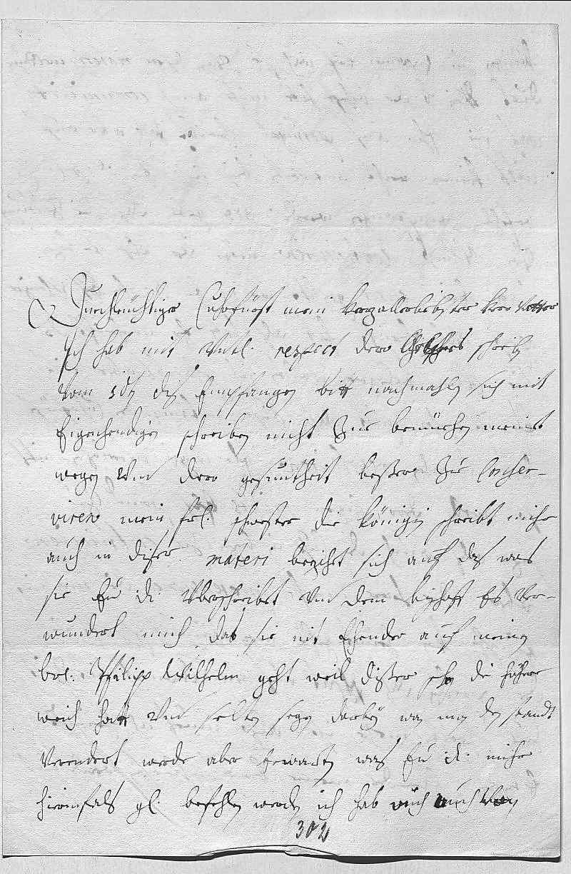 0001Durchleüchtiger Cuhrfürst, mein herzallerliebster herr vatter 0002Ich hab mit vnterdehnigstem respect dero gesches schreiben 0003vom 10ten dis empfangen. Bitt nachmahlen, sich mit 0004eigenhendigen schreiben nicht zue bemüehen meinet- 0005wegen vnd dero gesuntheit beßer zue conser- 0006viren. Mein fraw schwester, die Königin, schreibt mihr 0007auch in diser materi, bezihet sich auf das, was 0008sie ewer Durchlaucht vberschreibet vnd dem Bischoff . Es ver- 0009wundert mich, das sie nit ehender auf meinen 0010bruder Pfilipp Wilhelm geht, weil dißer schon die höhere 0011weich hatt vnd selten segen darbey, wan man den standt 0012verendert. Werde aber erwarten, was ewer Durchlaucht mihr 0013hierinfals gnädigst befehlen werden. Ich hab auch auch von
