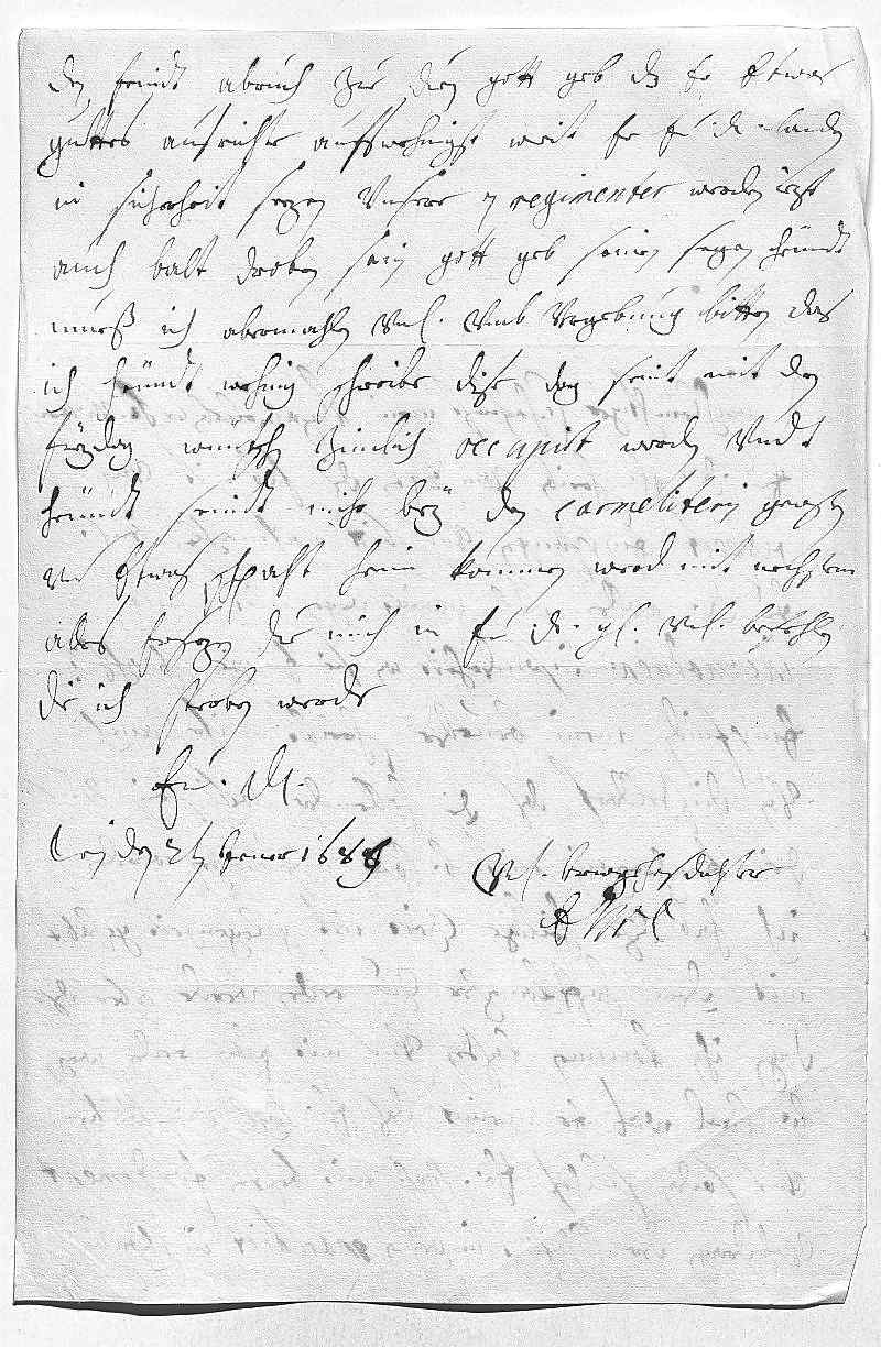0015den feindt abruch zue duen, gott geb, das er etwas 0016guettes ausrichte. Aufs wehnigst wirt er ewer Durchlaucht landen 0017in sicherheit sezen. Vnsere 7 regimenter werden iezt 0018auch balt droben sein, gott geb seinen segen. Heündt 0019mueß ich abermahlen vnterdehnigst vmb vergebung bitten, das 0020ich heündt wehnig schreibe, dise dag seint mit den 0021feyerdag wüntschen zimlich occupirt worden, vndt 0022heündt seindt mihr bey den carmeliterin geweßen 0023vnd etwas schpaht heim kommen, werd mit nechstem 0024alles ersezen. Due mich in ewer Durchlaucht gnade vnterdehnigst befehlen, 0025die ich sterben werde 0026ewer Durchlaucht 0027vnterdehnigste trewgehorsamste dochter 0028EMT 0029Wien den 2ten jener 1689
